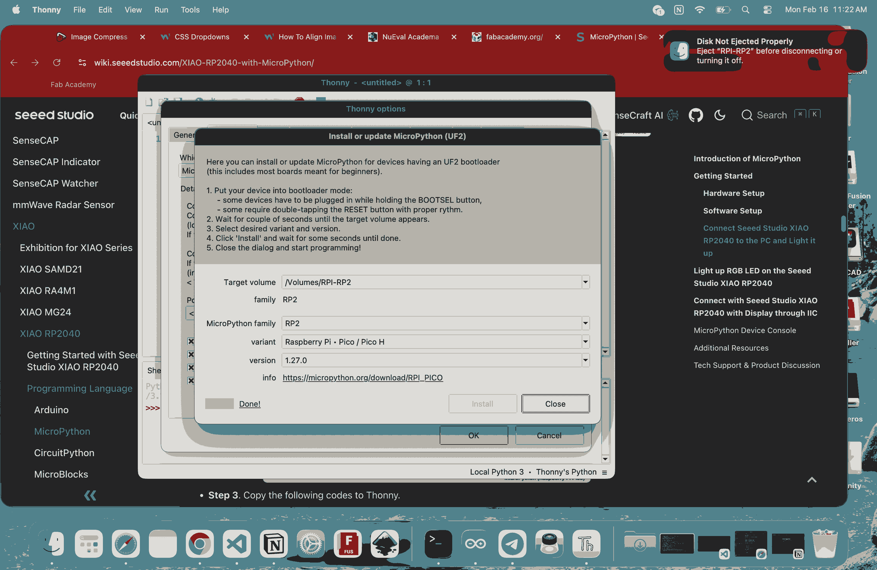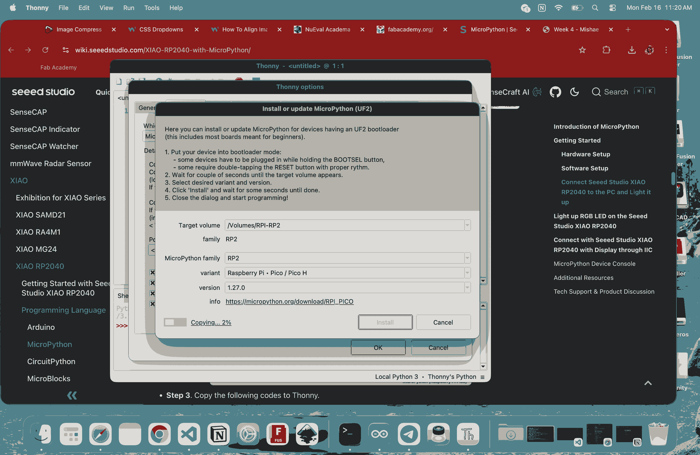 Next, I installed the MicroPython firmware onto the board. To do this, I pressed and held the BOOT button on the XIAO RP2040 and connected it to my computer. The board appeared as an RPI-RP2 drive. In Thonny, I clicked on “Install or Update MicroPython,” kept the default version, and clicked Install. This successfully flashed the MicroPython firmware onto the board.