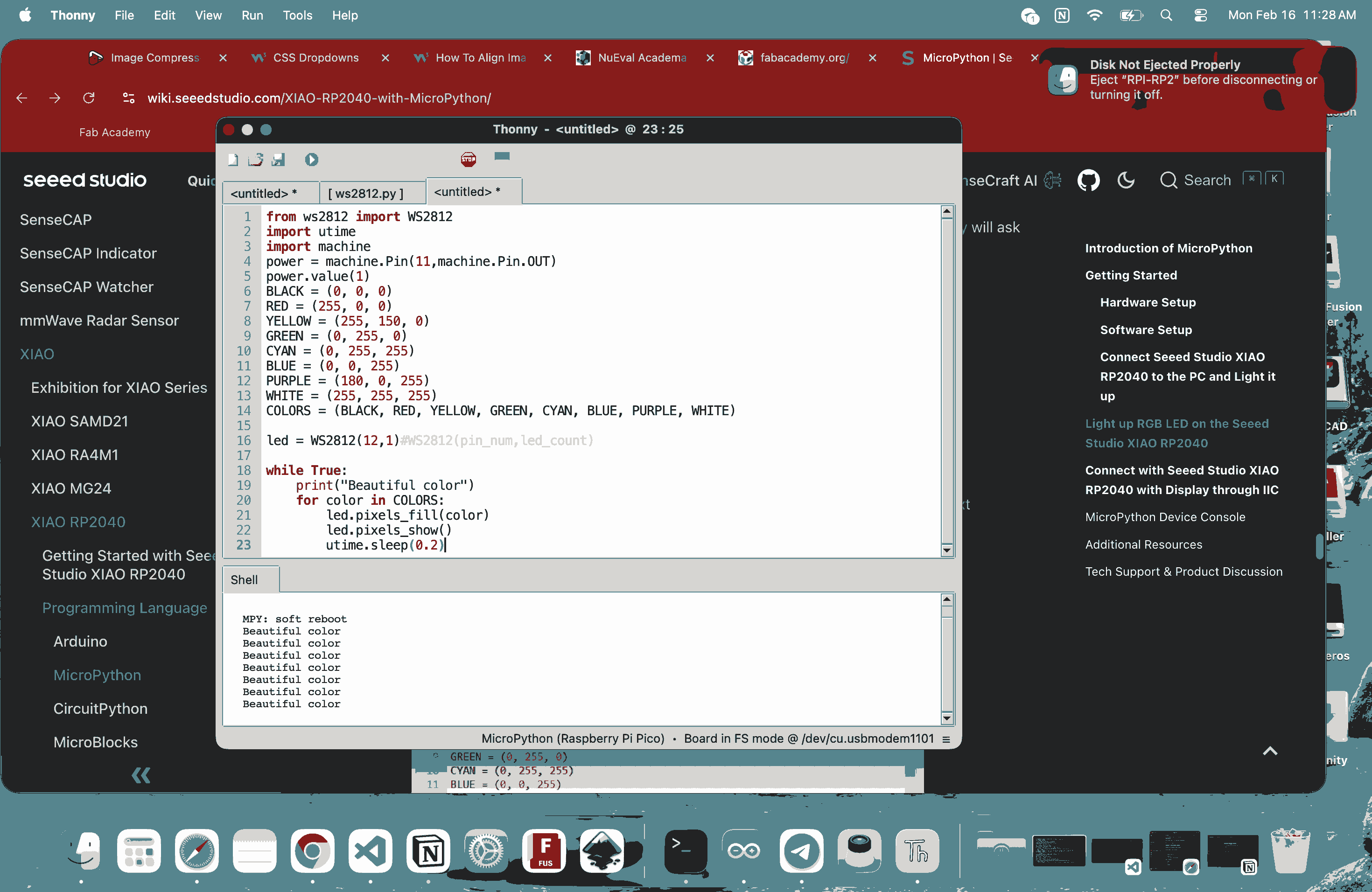 To control the RGB LED, I added an external library. I downloaded the ws2812.py file, opened it in Thonny, and saved it directly to the Raspberry Pi Pico. I made sure the file name was exactly ws2812.py, since any change in the name would prevent it from working. After that, I used the code from wiki seeed studio for the RGB LED program and ran it. The LED cycled through different colors, and the corresponding output was visible in the Shell.