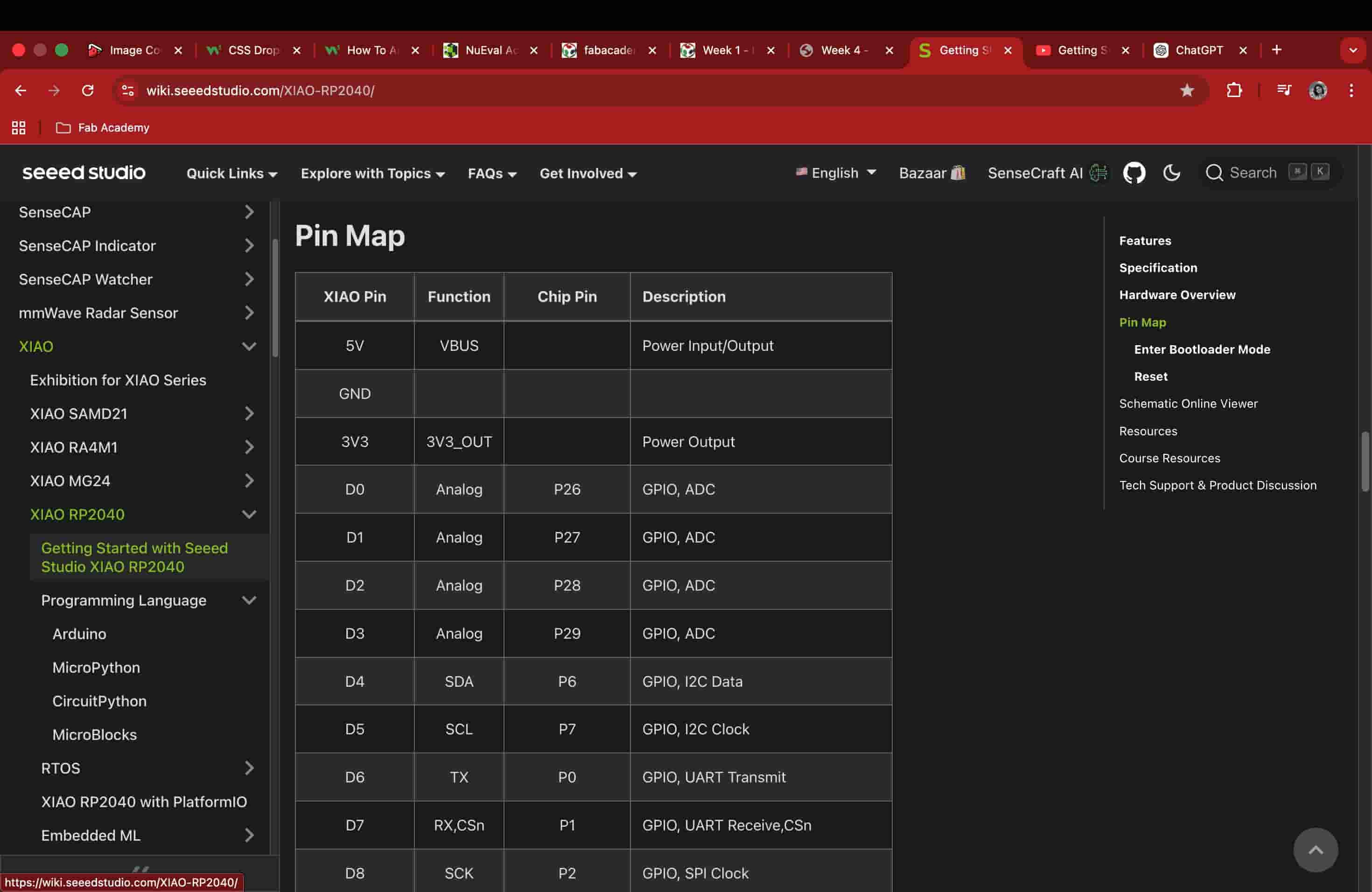 The datasheet explains that the RP2040 has 30 GPIO pins (GPIO0–GPIO29). However, the XIAO board does not expose all of them. Only a subset is available as labeled pins like D0, D1, D2, etc. Each GPIO pin can be configured as input or output. This directly relates to my project: