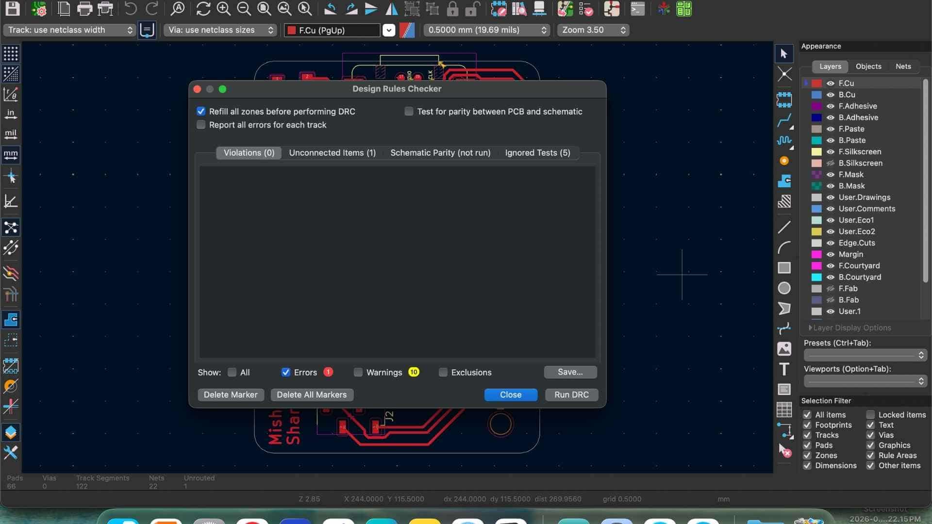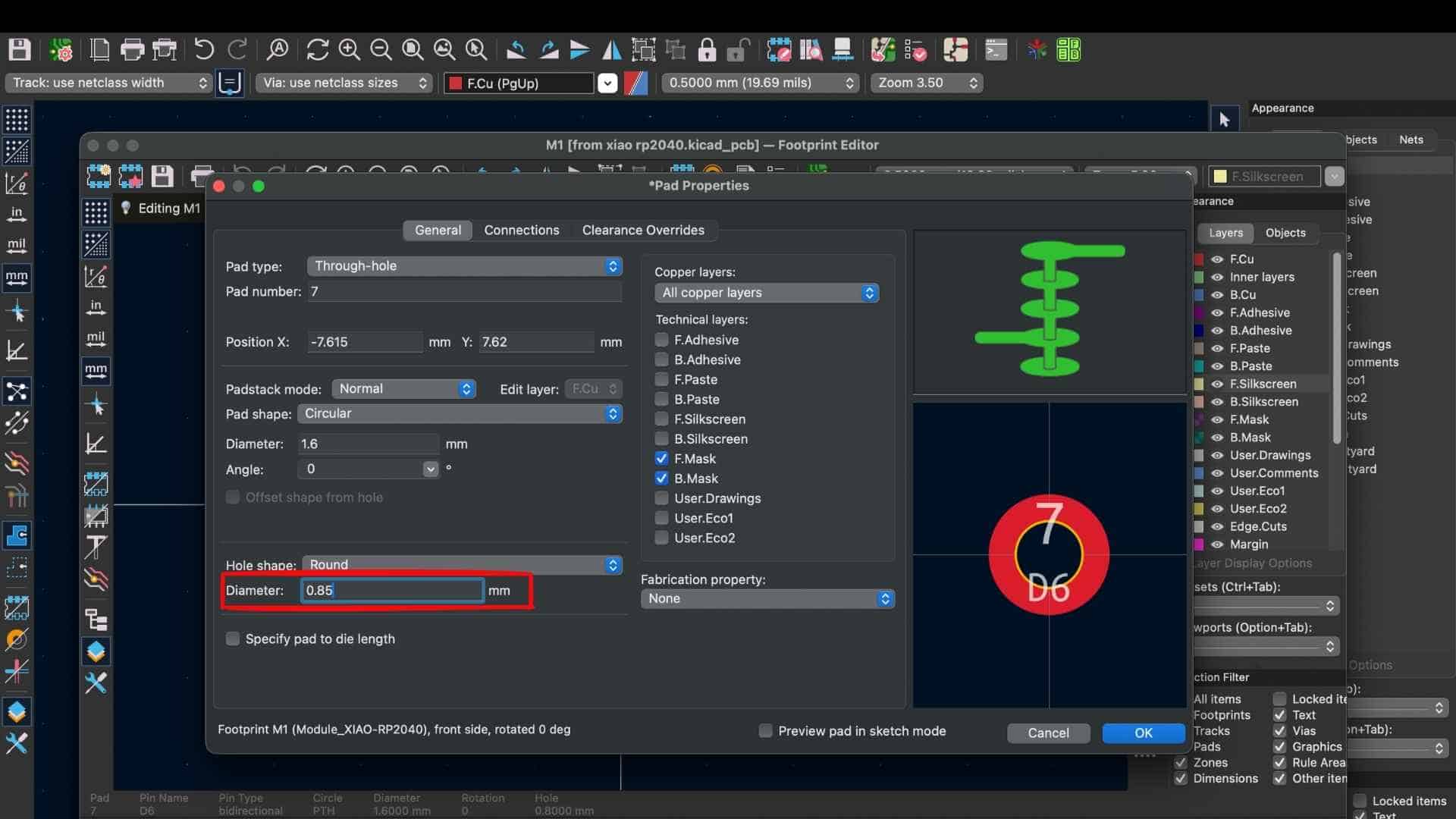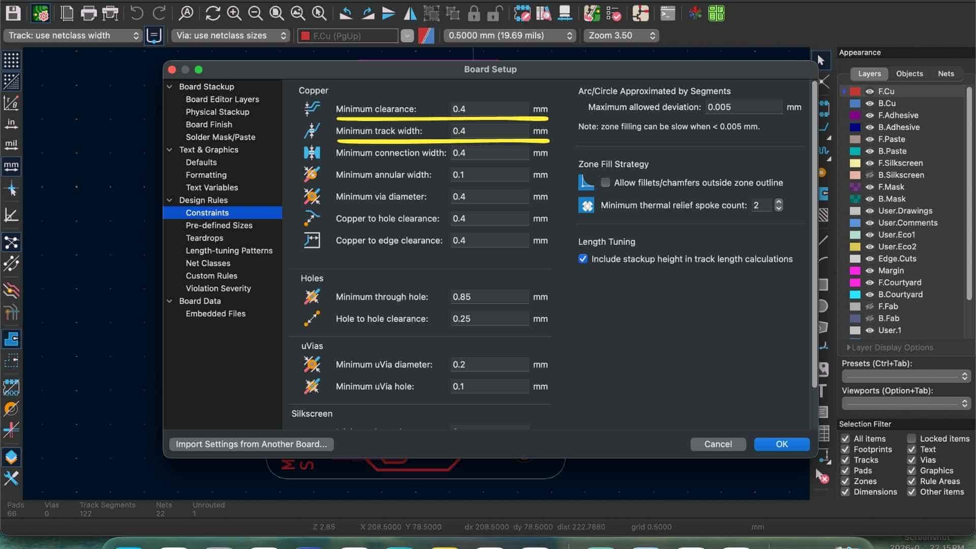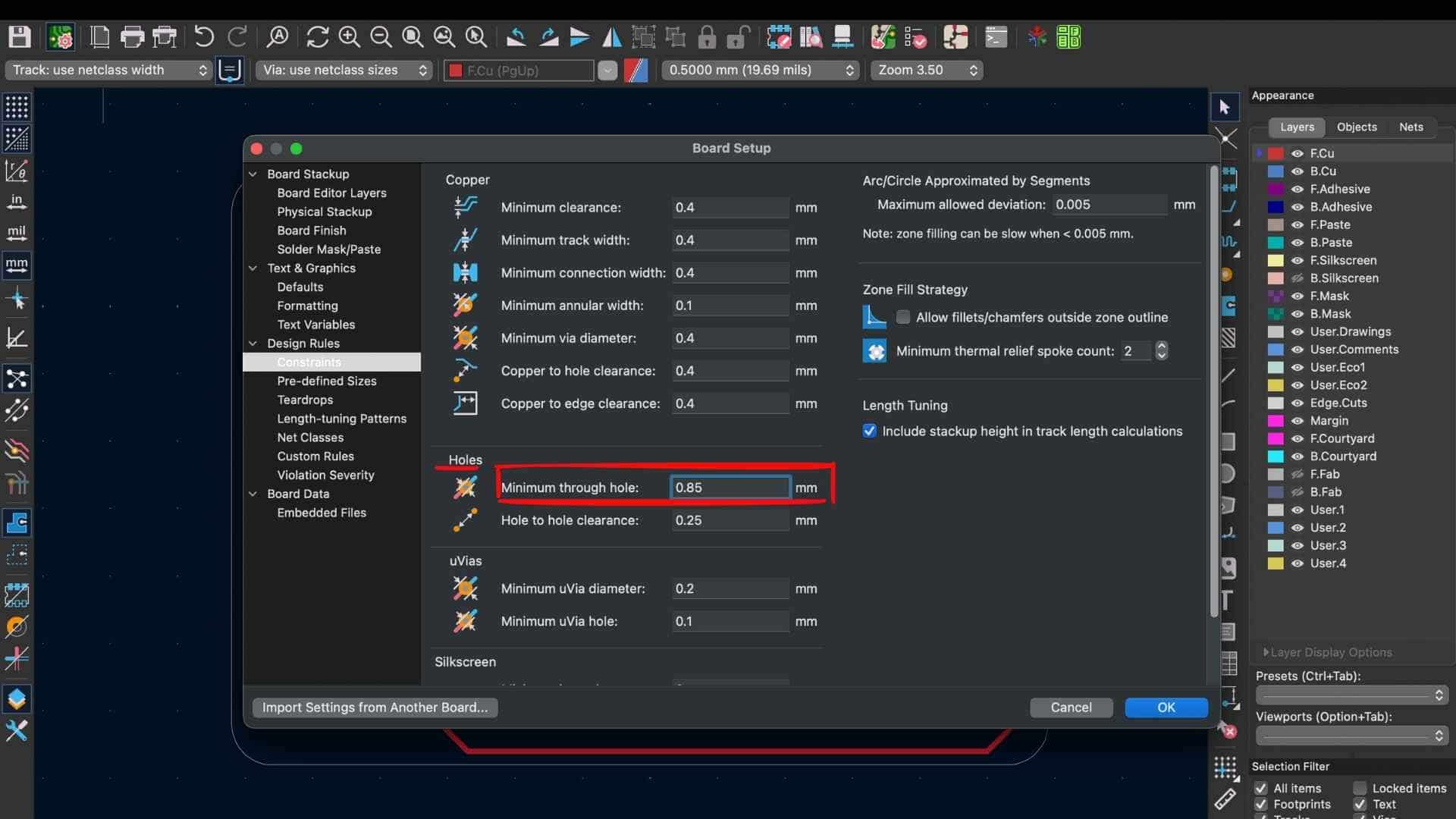 In KiCad PCB Editor, the minimum through-hole constraint was first changed from 0.8 mm to 0.85 mm.