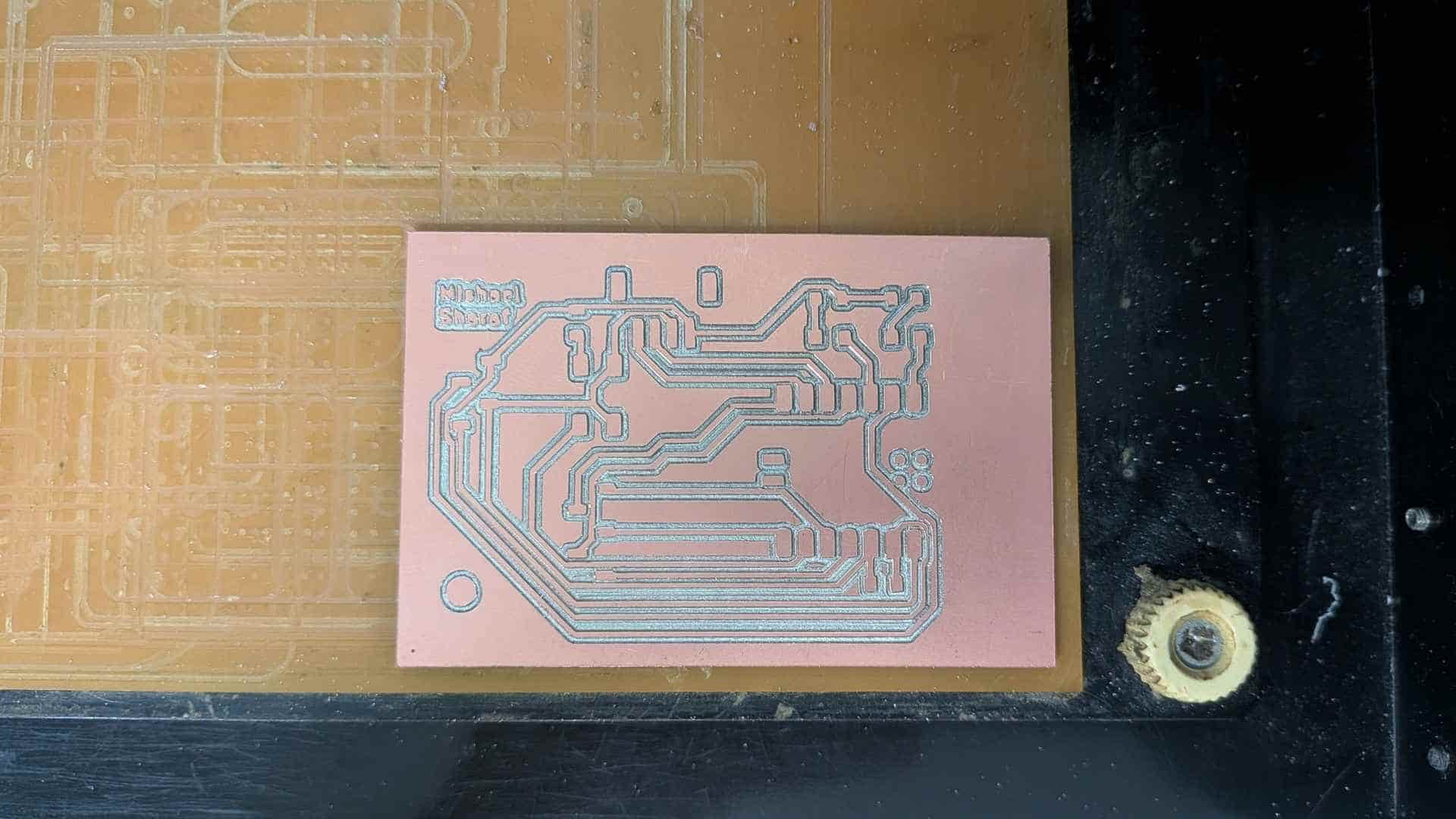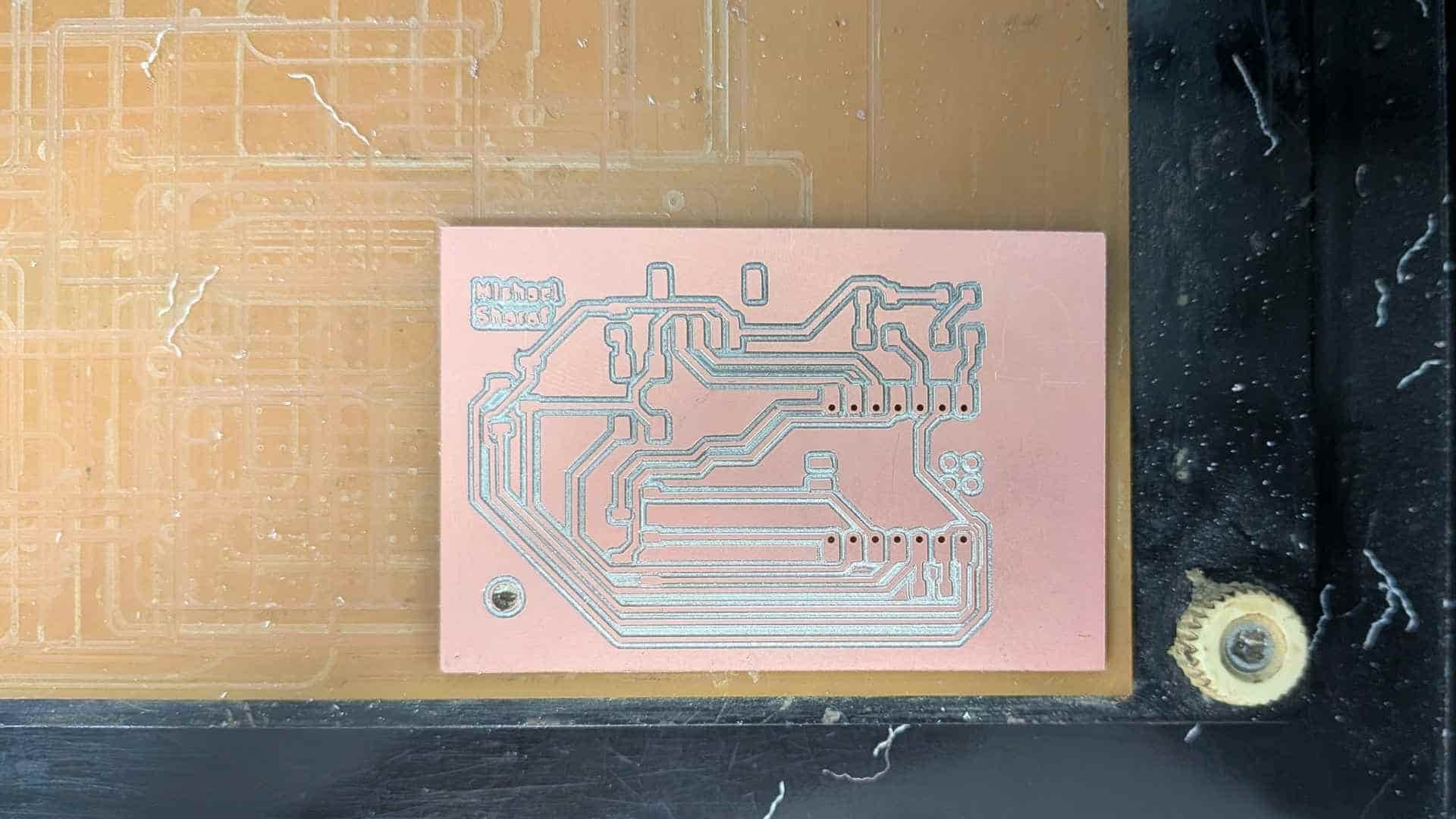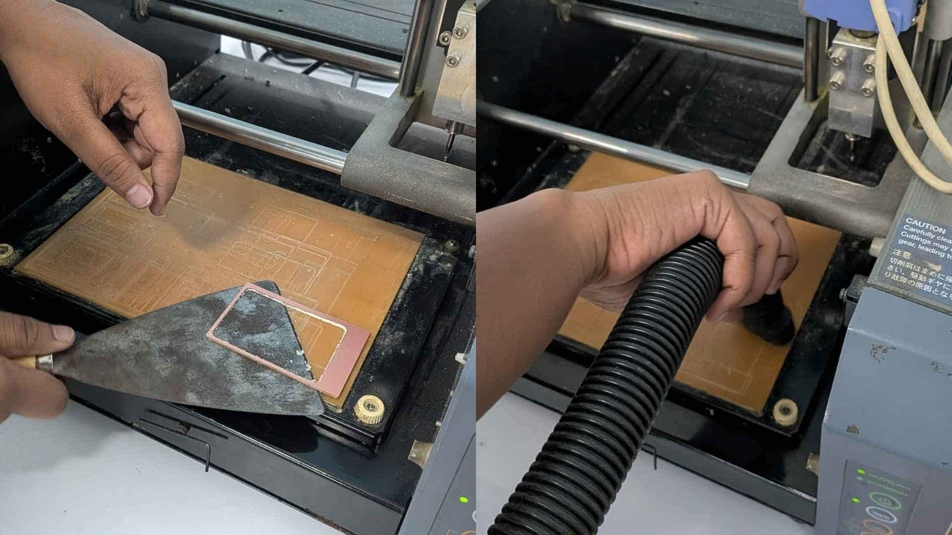 After the milling was completed on the Roland Modela MDX-20, the PCB was carefully removed from the machine bed using a scraper.