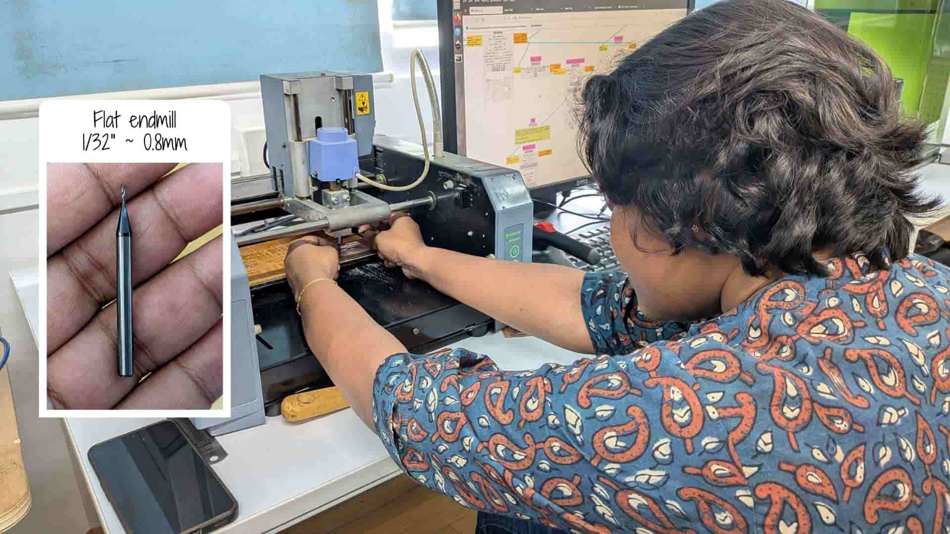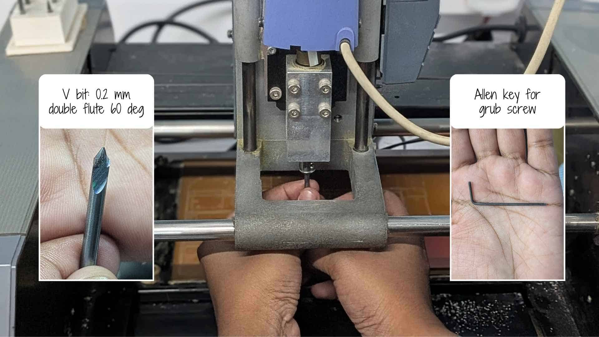 Using an Allen key, the grub screw was loosened and the V-bit was inserted. The machine was then returned to the origin position. The bit was gently lowered until it touched the PCB surface, after which the grub screw was tightened. This procedure set the Z-axis reference for milling the traces.