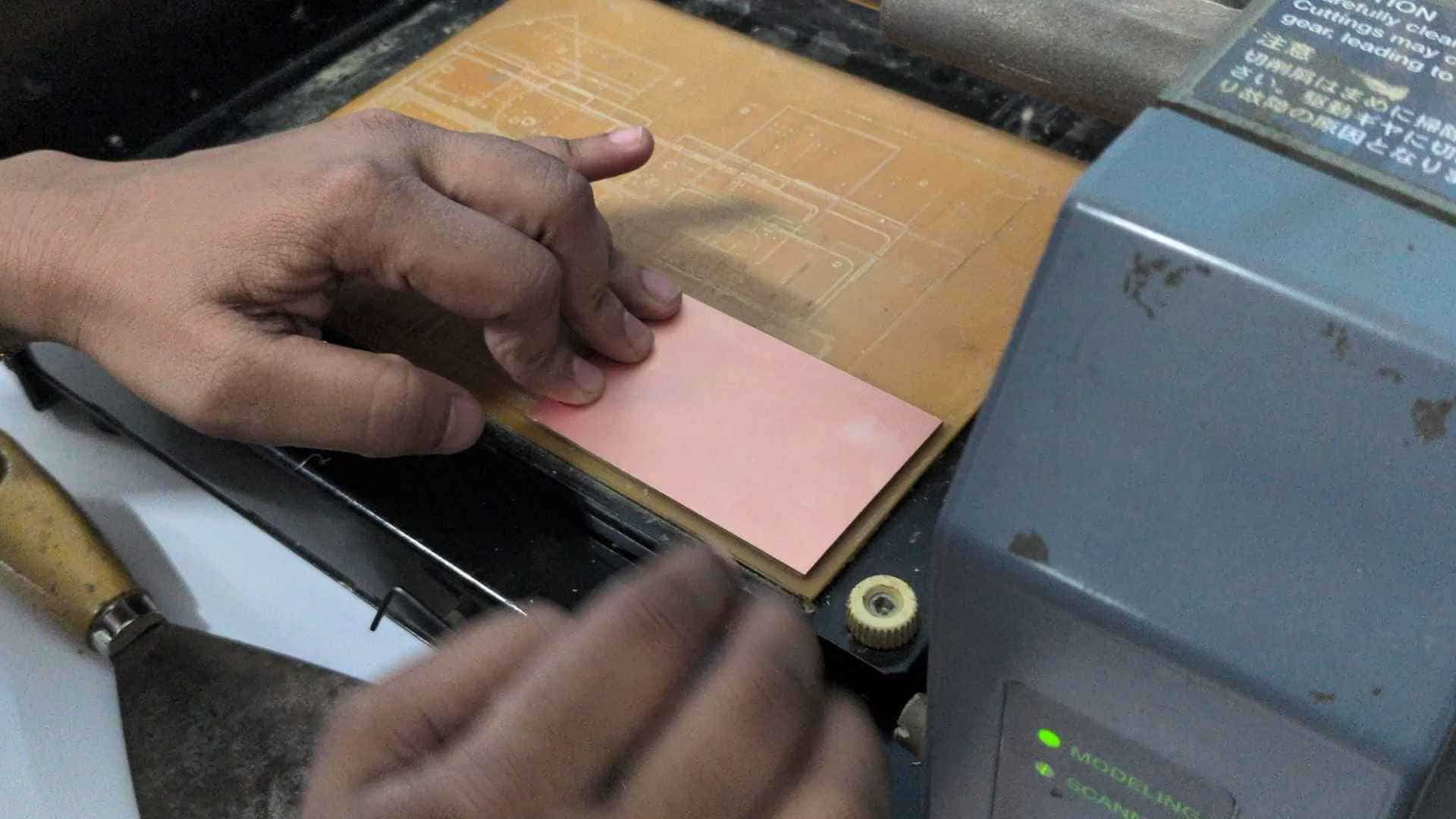 The PCB blank was first fixed onto the bed of the Roland Modela MDX-20 using double-sided tape to ensure it remained stable during milling.