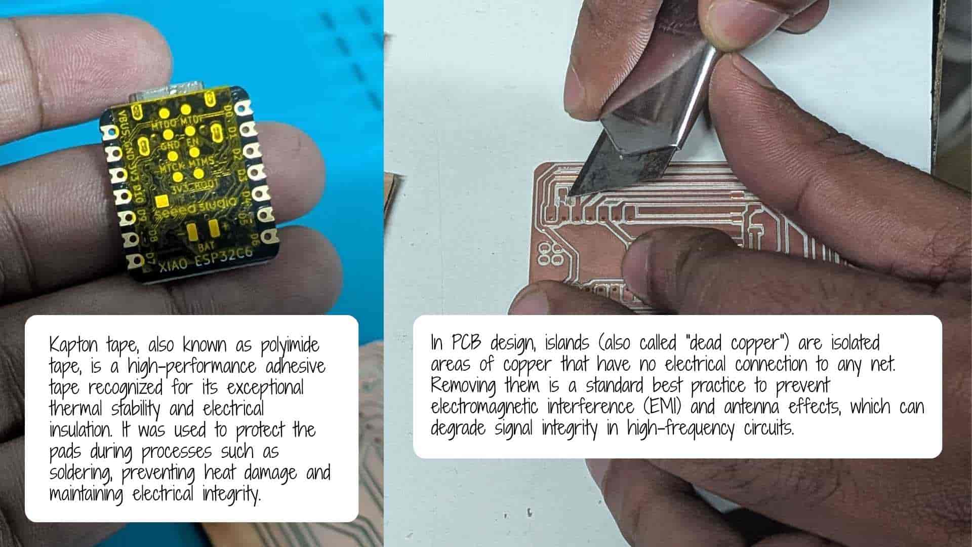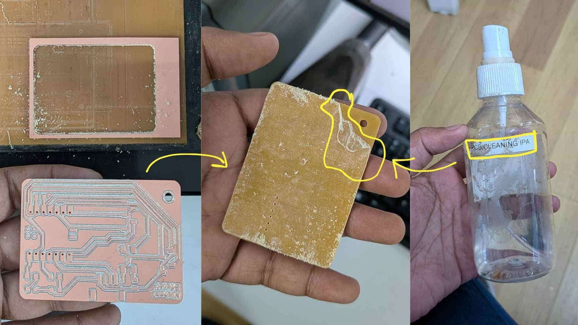 Any remaining adhesive from the double-sided tape was cleaned using an IPA (isopropyl alcohol) solution, which helped remove the sticky residue from the back of the board and left the PCB clean for the next step of assembly.