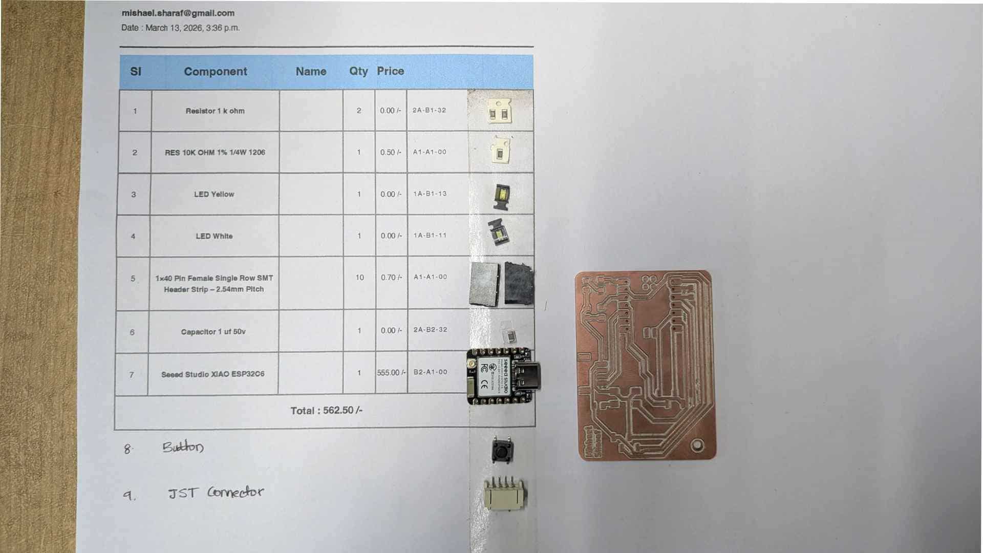 After milling the PCB, the required components were searched in FabStash. Most components were available in the inventory system, but the button and JST connector were not listed even though they were physically available. These were noted manually on the printed request sheet.