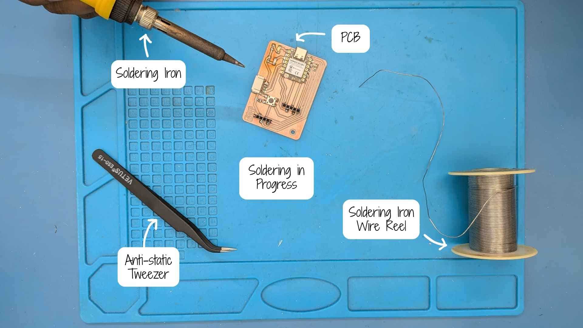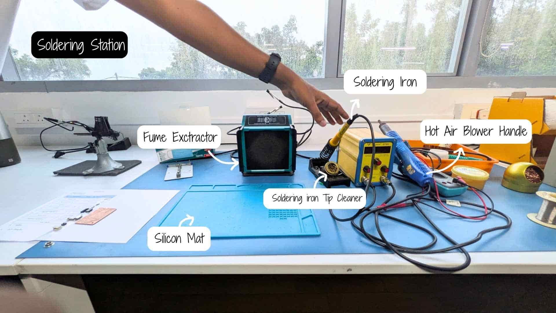 Before starting assembly, the basic soldering workstation setup was introduced. The station included the essential tools used for surface-mount soldering: