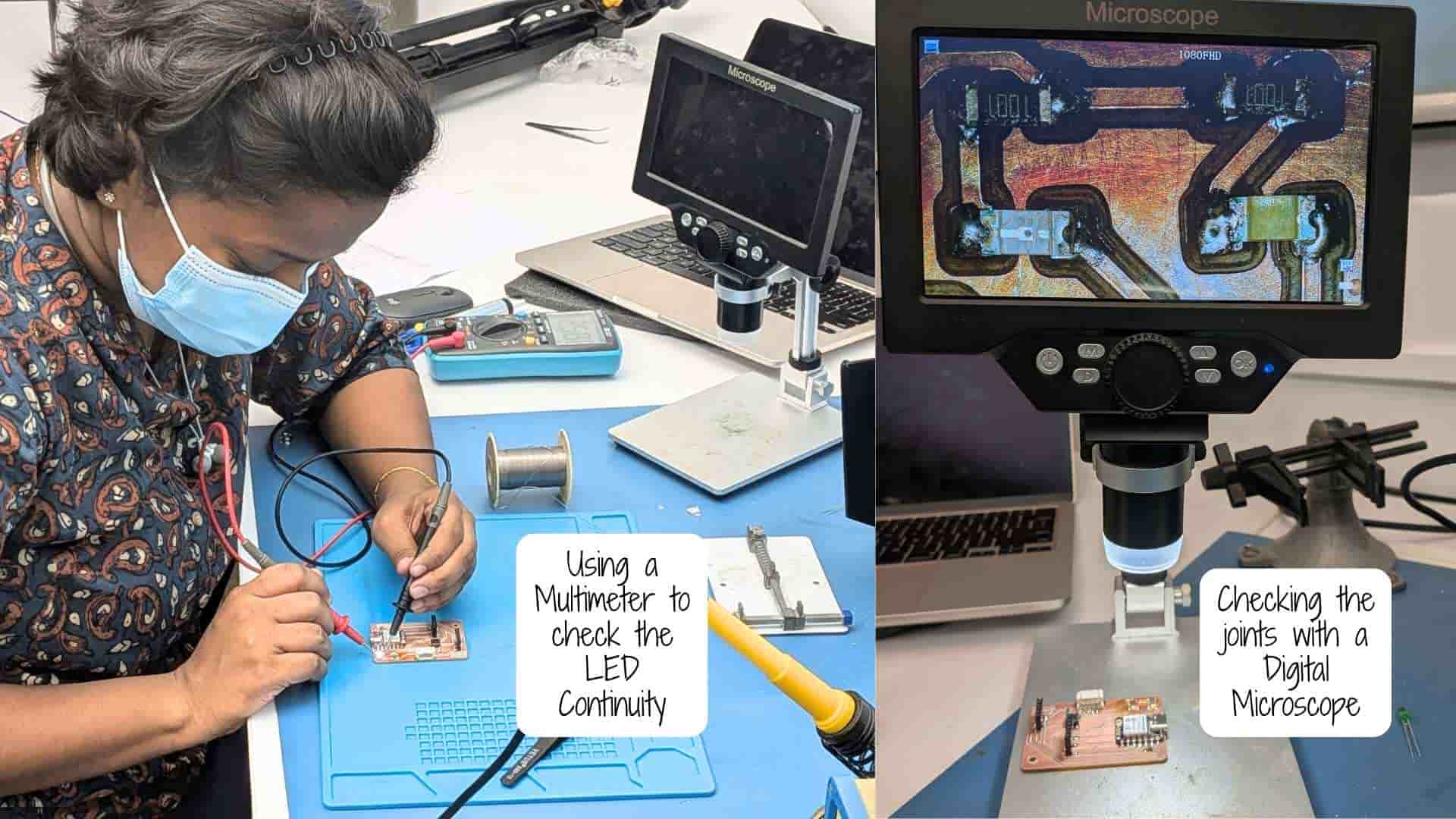 A digital microscope was also available at the soldering station to inspect the joints closely. It helped check the quality of the solder connections, identify solder bridges, and ensure that the small surface-mount components were properly aligned and connected.