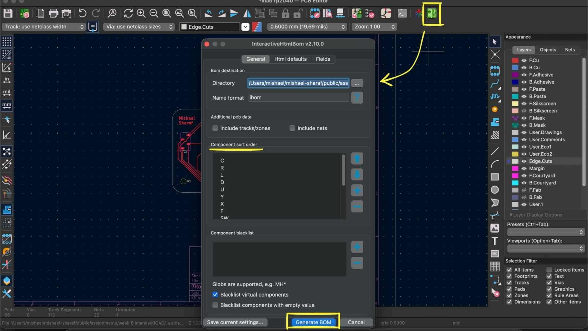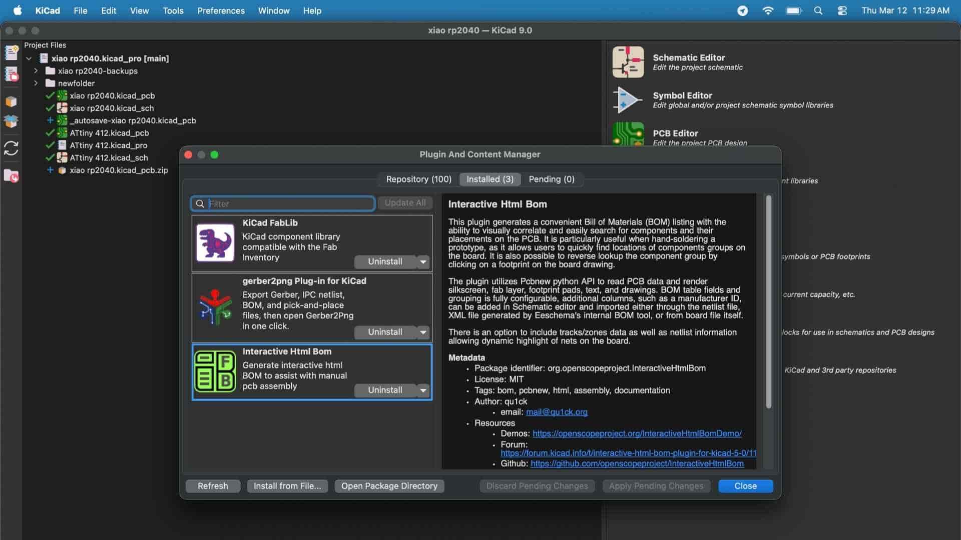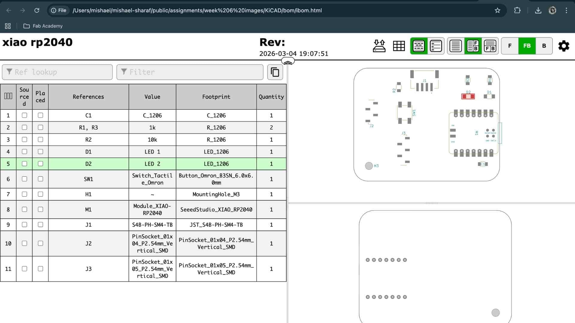 The Interactive HTML BOM (iBOM) plugin was installed in KiCad to support the soldering and assembly process. It generates an interactive HTML page where each component listed in the Bill of Materials is directly linked to its exact location on the PCB layout. This makes it easier to identify, locate, and place components accurately during soldering.