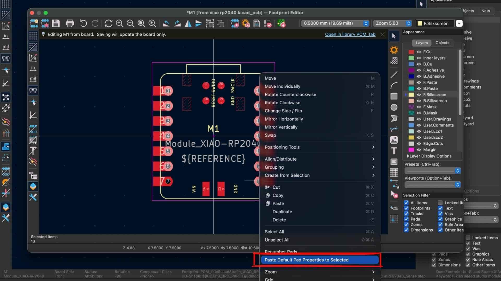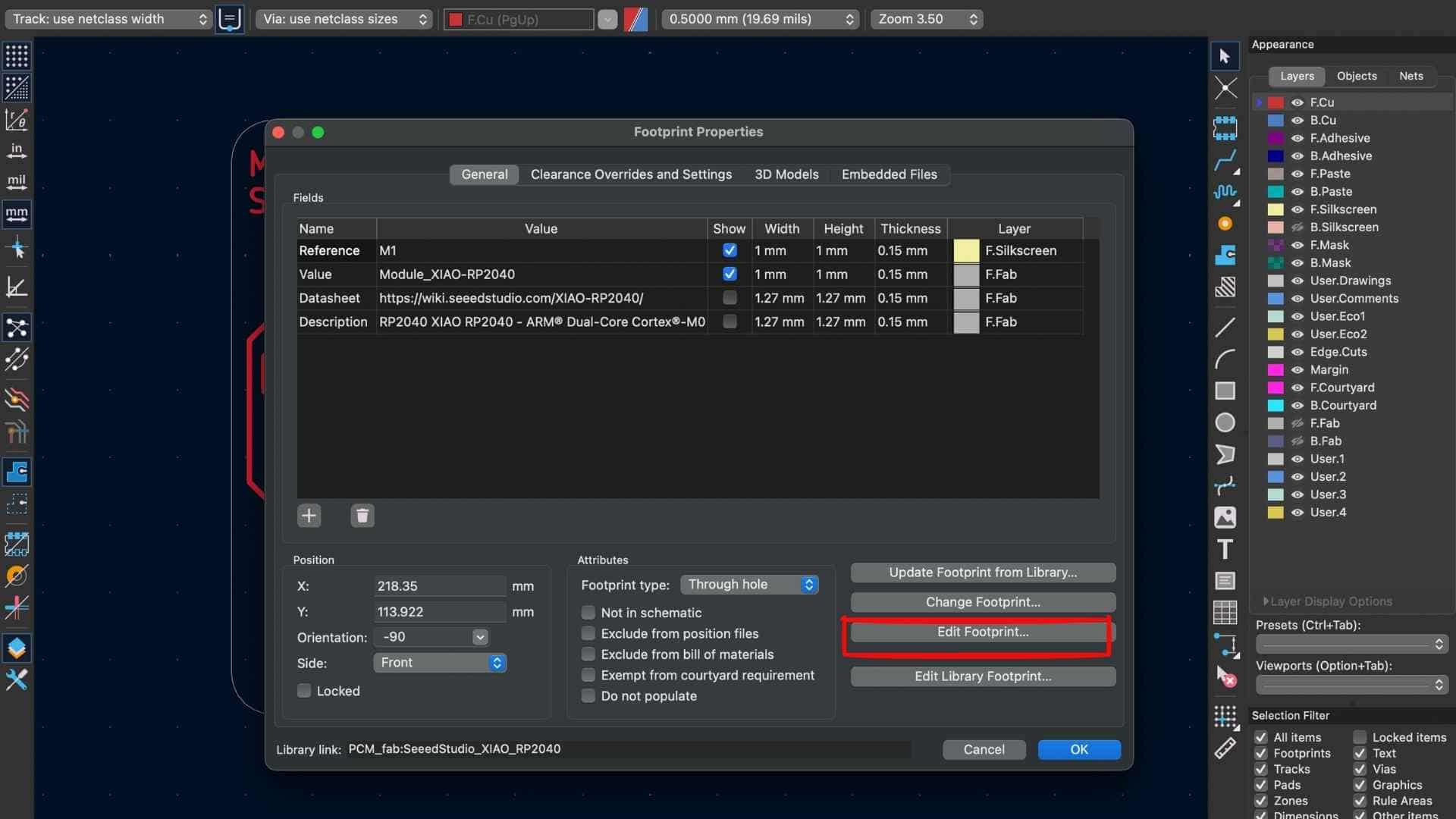 To further resolve this issue, the footprint in KiCad had to be modified. Steps taken: