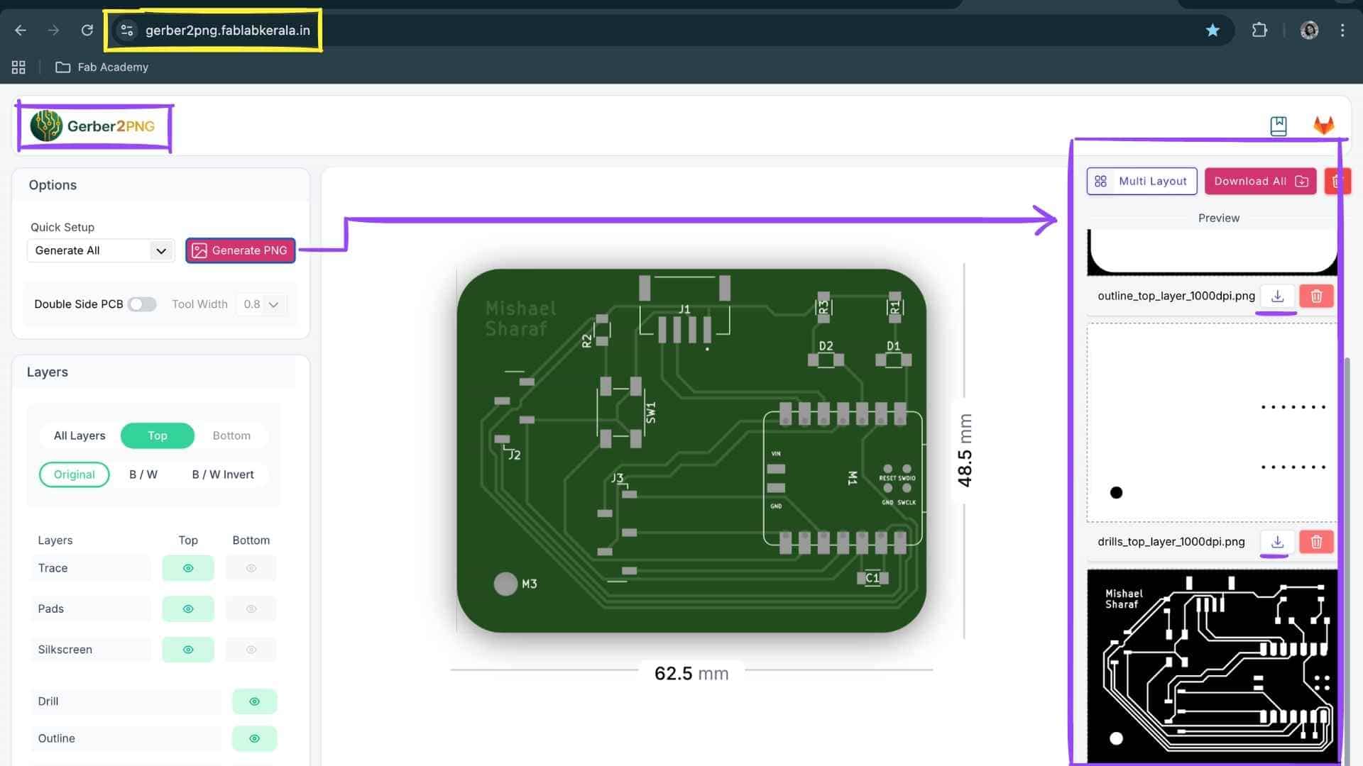 After loading the traces PNG, drill PNG, and outline PNG, the toolpaths were calculated using the Calculate function in Mods. The traces and outline appeared correctly in the calculated preview. However, when the drill PNG was loaded, the pin holes for the microcontroller (XIAO RP2040) were not visible in the calculated toolpath preview.