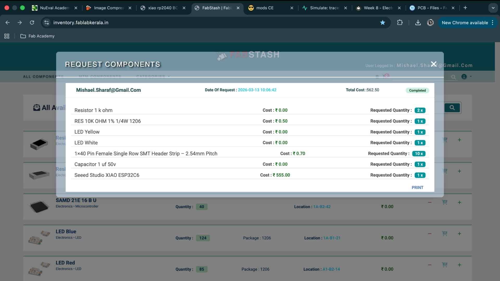 To obtain the electronic components required for PCB assembly, the Fab Lab Kerala inventory system called FabStash is used. This platform allows students to search the lab inventory and request components needed for their projects.