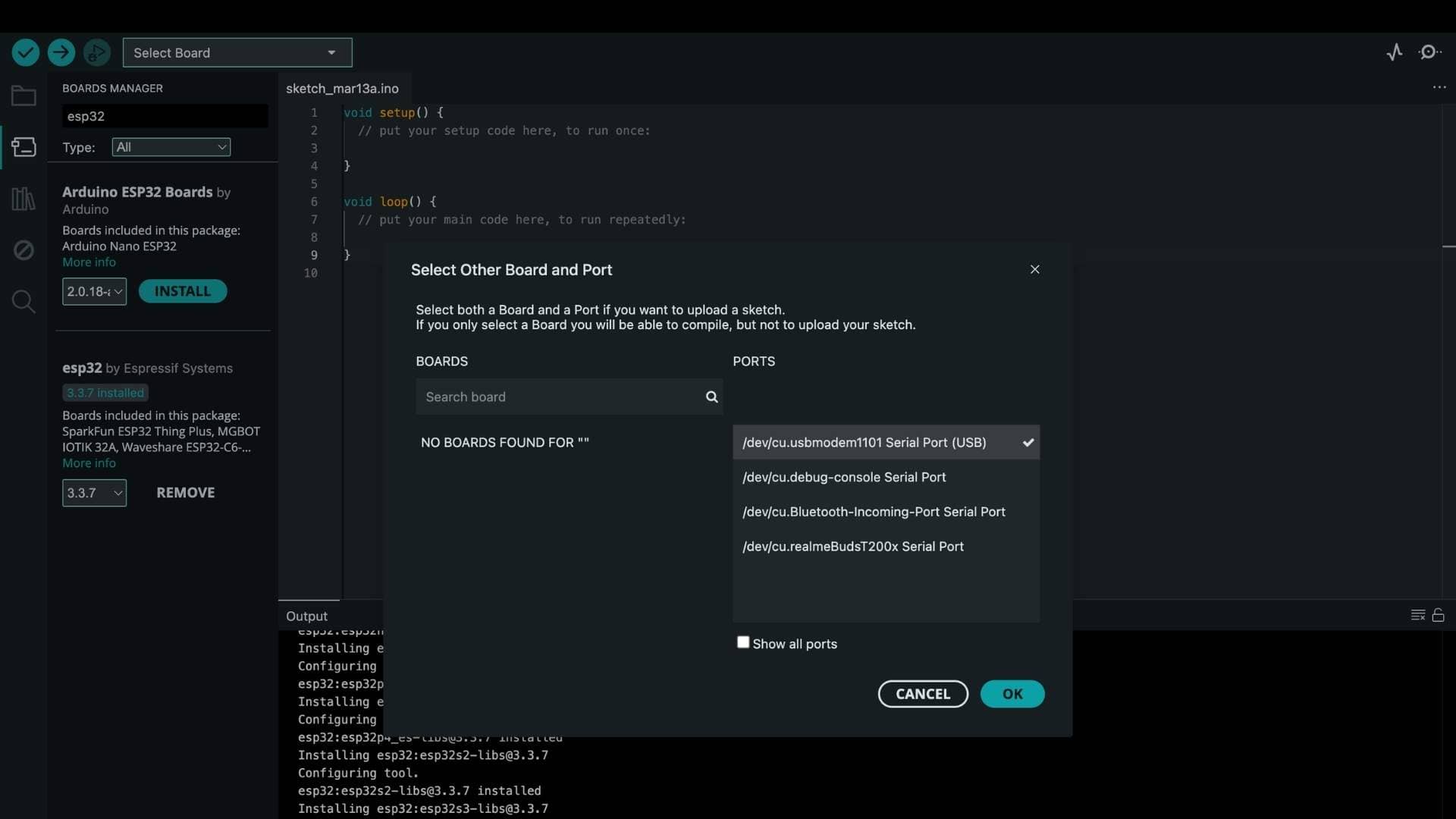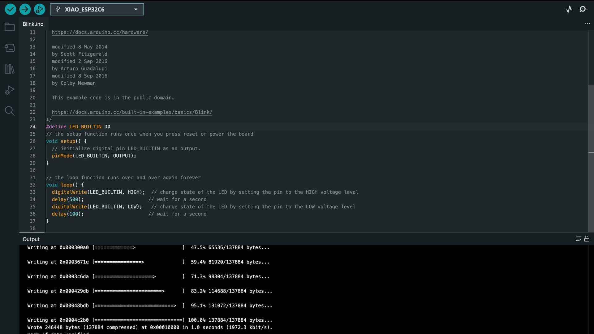 The required board package was installed, the correct board and port were selected in the Arduino IDE, and the Blink example program was uploaded.