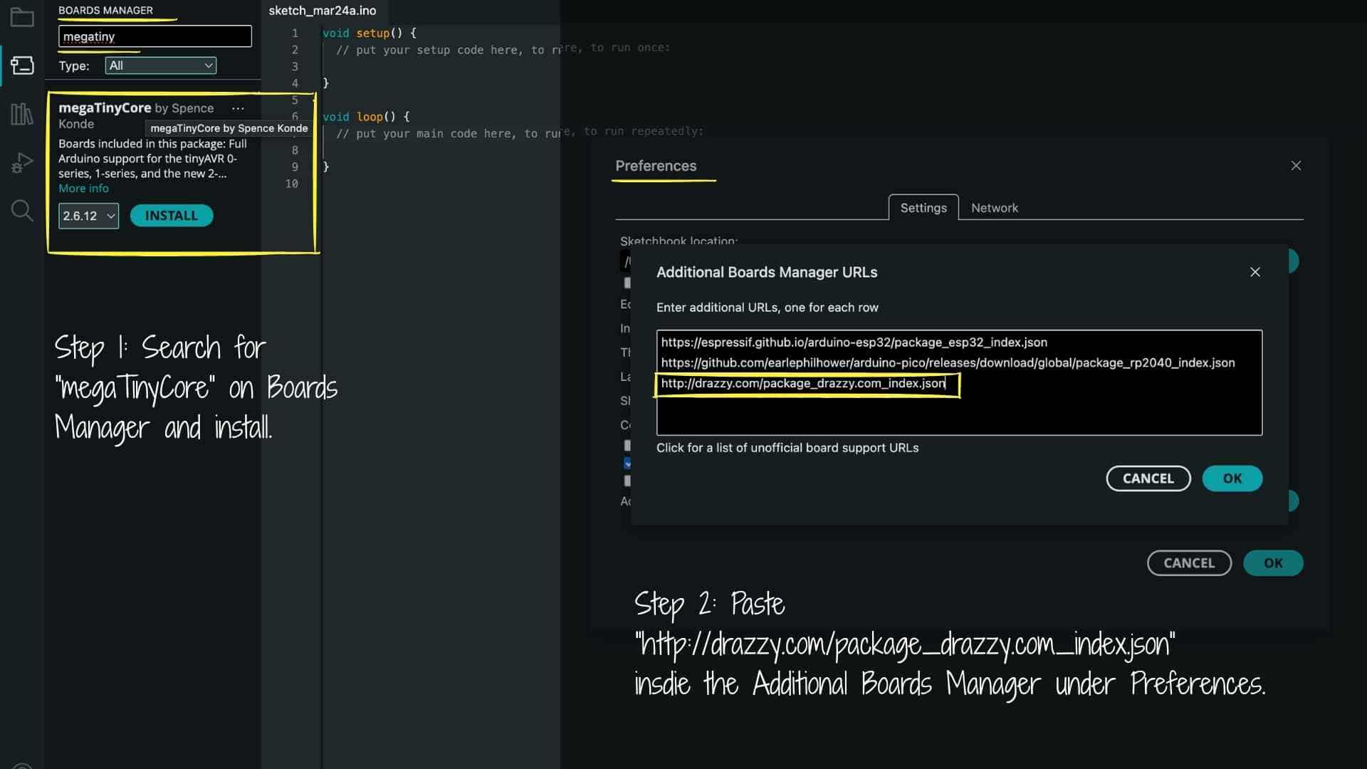 void setup() { Serial.begin(115200); delay(2000); Serial.println("HELLO FROM ATTINY"); } void loop() { delay(2000); Serial.println("HELLO FROM ATTINY"); }