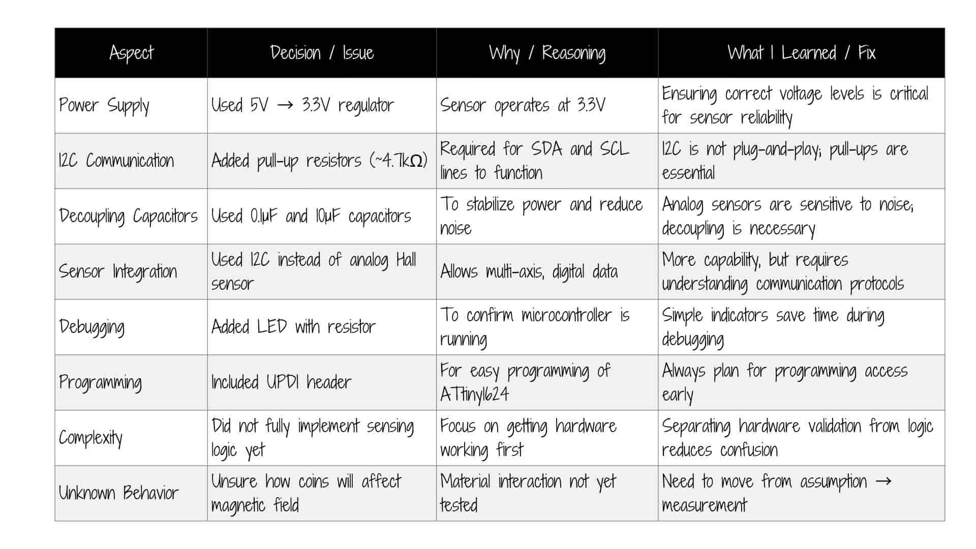 What I didn’t anticipate was how much was involved just to get it running. It required a 3.3V setup, along with capacitors, pull-up resistors, and I²C communication. I initially used Neil’s code but couldn’t understand the output, so I used ChatGPT to make it human-readable and later modified it to only show values when there is a change in the magnetic field.
