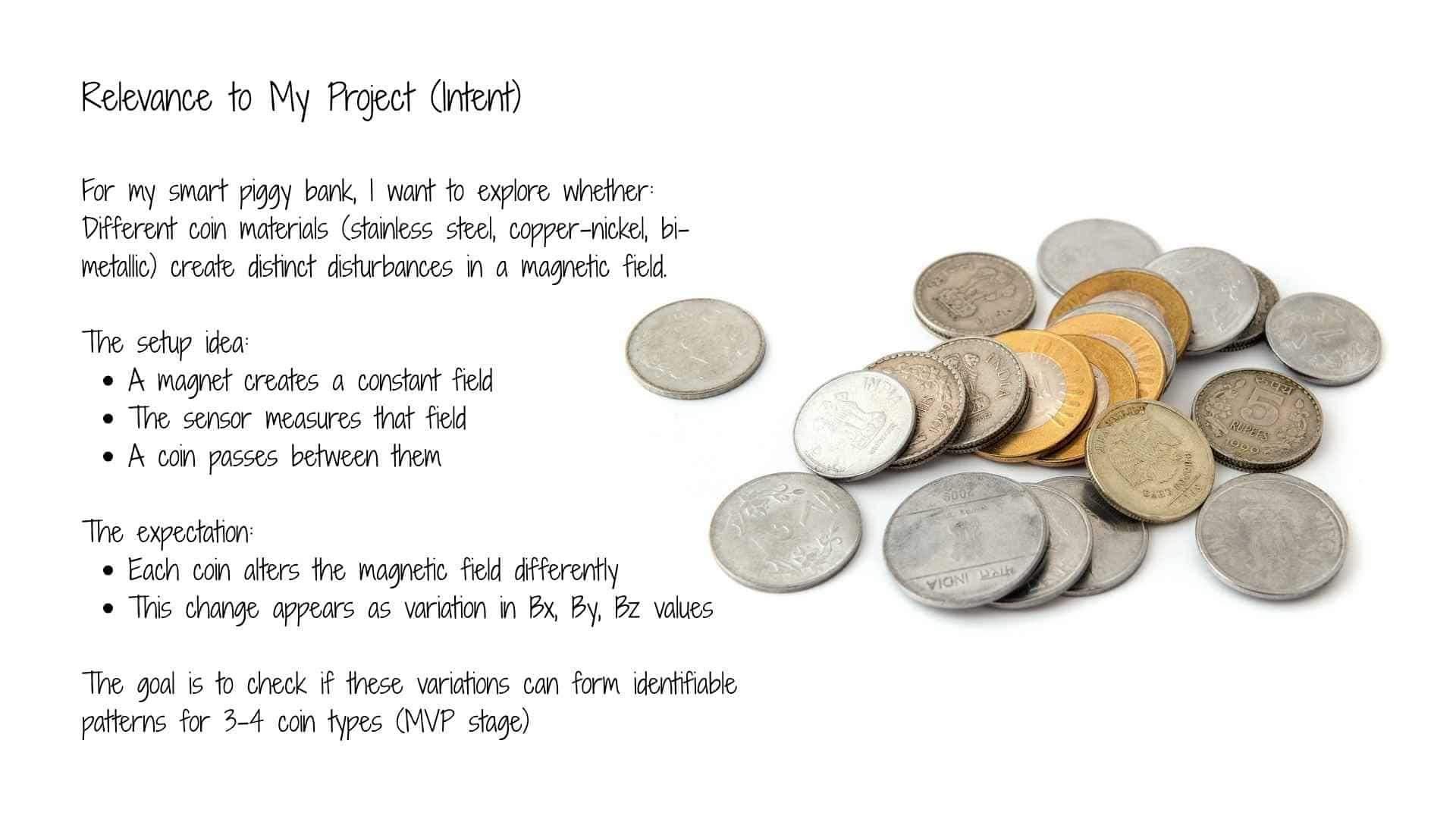 In this project, the goal is not simply to detect a magnet, but to observe how a coin affects the magnetic field between a magnet and the sensor. This interaction is subtle and depends on the material and position of the coin.