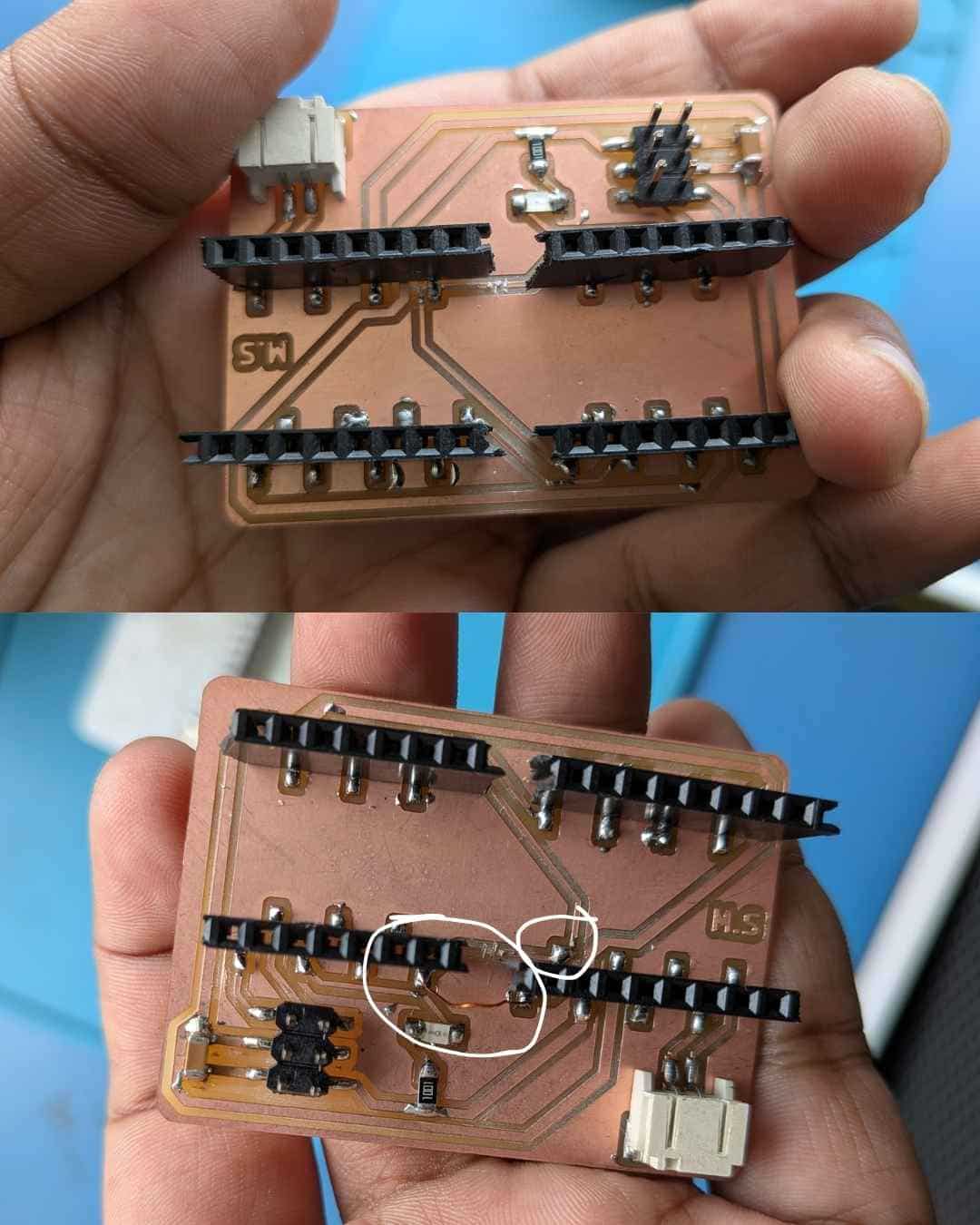 An initial misrouting of the RX and TX lines was identified during testing. This issue was resolved through PCB rework by introducing a copper jumper wire to resolder and reroute the affected traces. Following this correction, proper communication was successfully established.