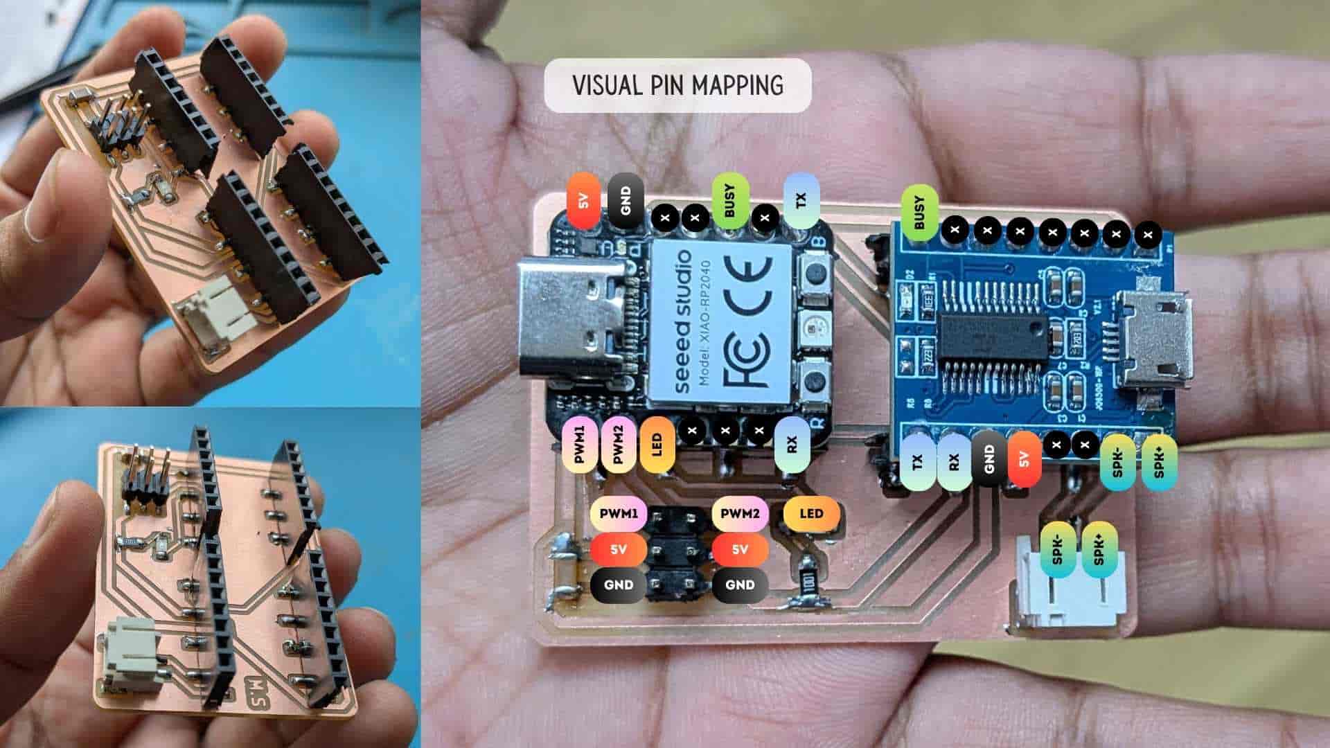 This week I designed a single-sided FR1 board to test two output devices together, a MG90S servo motor and a JQ6500 V2.1 MP3 module with an 8Ω 3W speaker. The idea was to have one board where the XIAO RP2040 plugs in via female headers and controls both devices independently.
