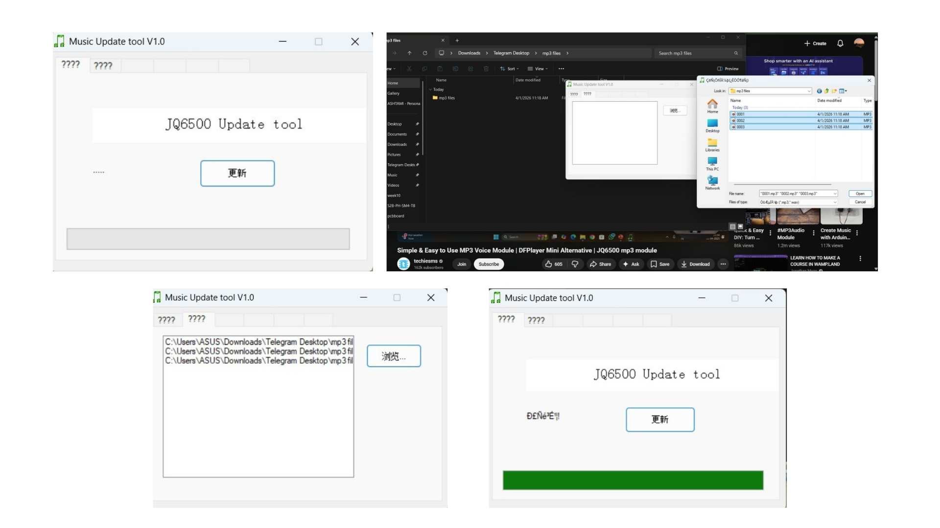 Libraries and softwares to be installed: JQ6500 Serial, Music update tool software can be downloaded and used to update the soundtracks by connecting a mini USB to the computer.