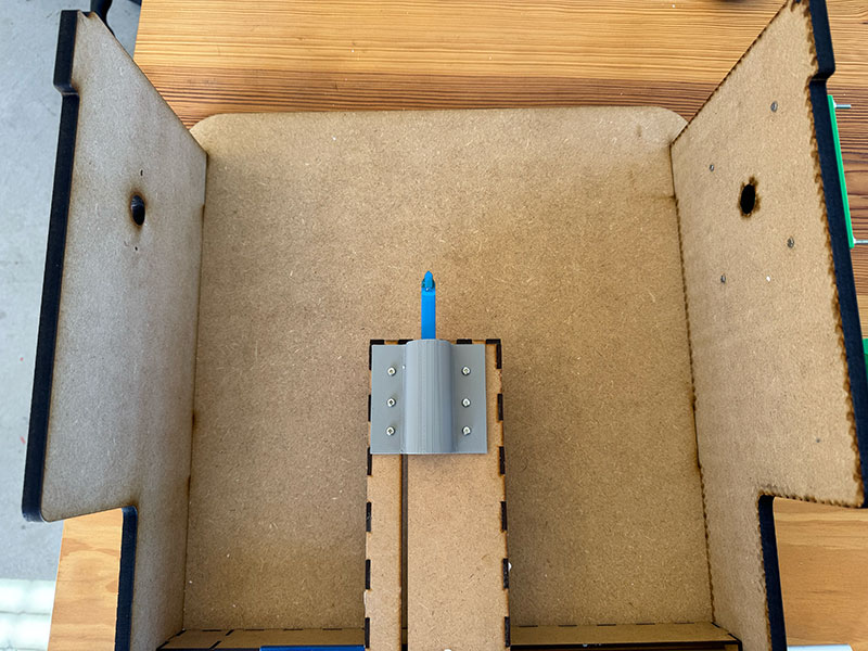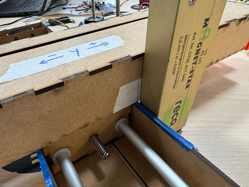 At that point, we decided to redesign the structure. We added both a bottom base and a top support, reinforcing the entire Z axis assembly. In addition, we switched to a thicker material, using 10 mm MDF, which significantly improved the rigidity and overall consistency of the system.