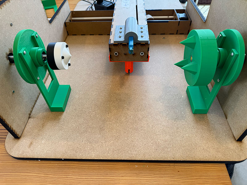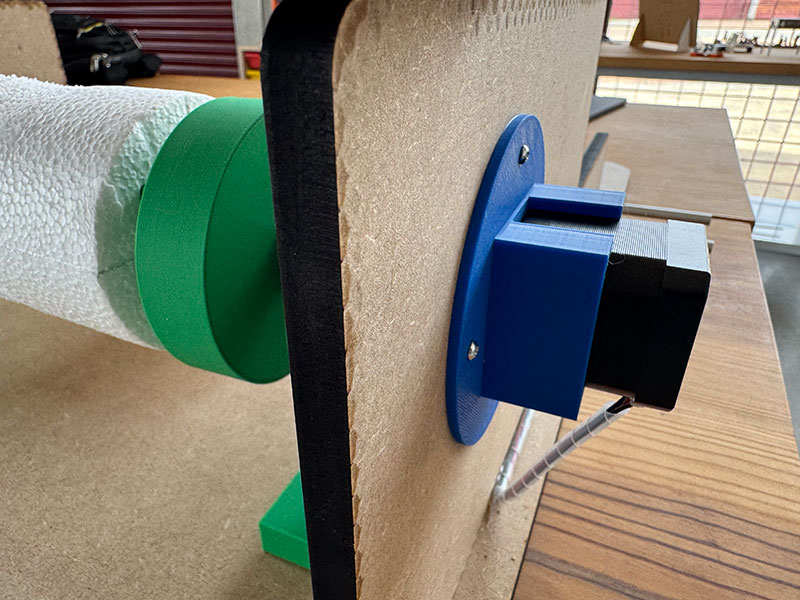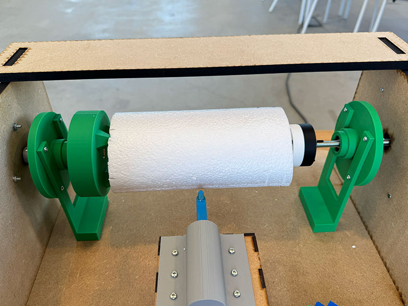 To solve this, we designed an asymmetrical system: the motor side (left) remains fixed, while the opposite side (right) is adjustable. This allows us to adapt the distance between both ends depending on the size of the material being used.
