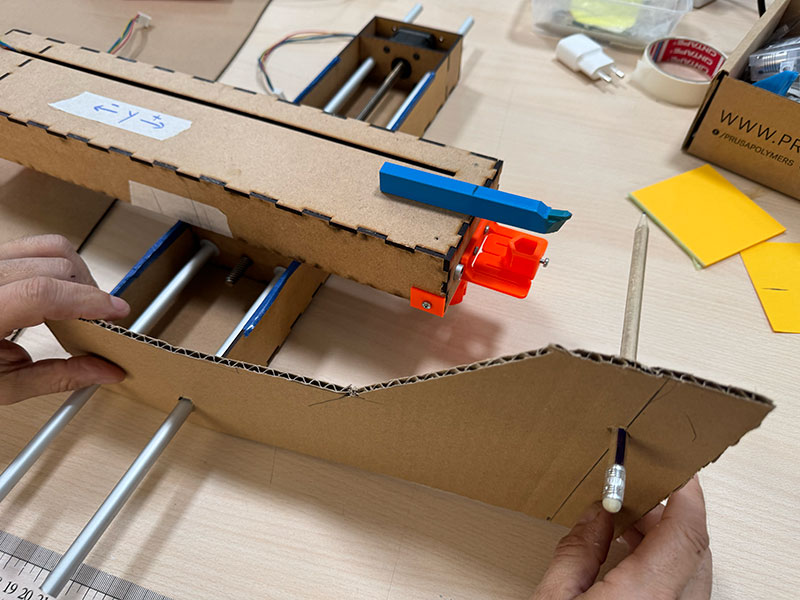 The goal of this mockup was to accurately define the height of the Z axis, making sure it aligned perfectly with the tip of the cutting blade mounted on the Y axis. This adjustment was critical, as even small deviations would directly affect the machine’s performance and cutting accuracy.