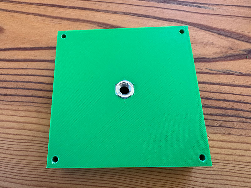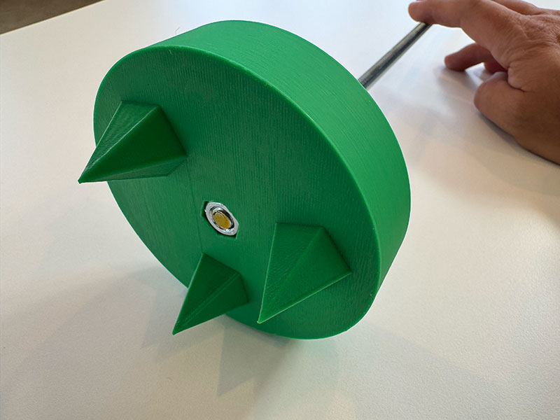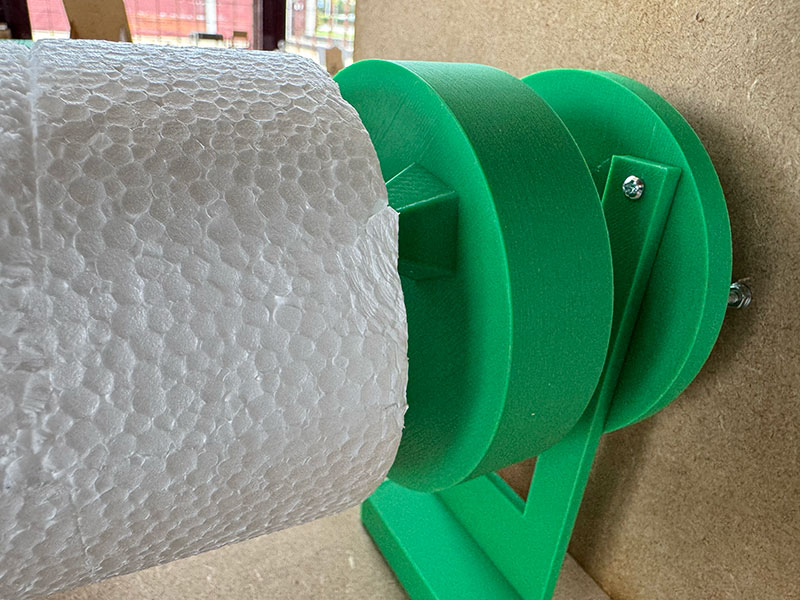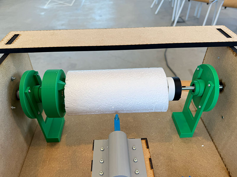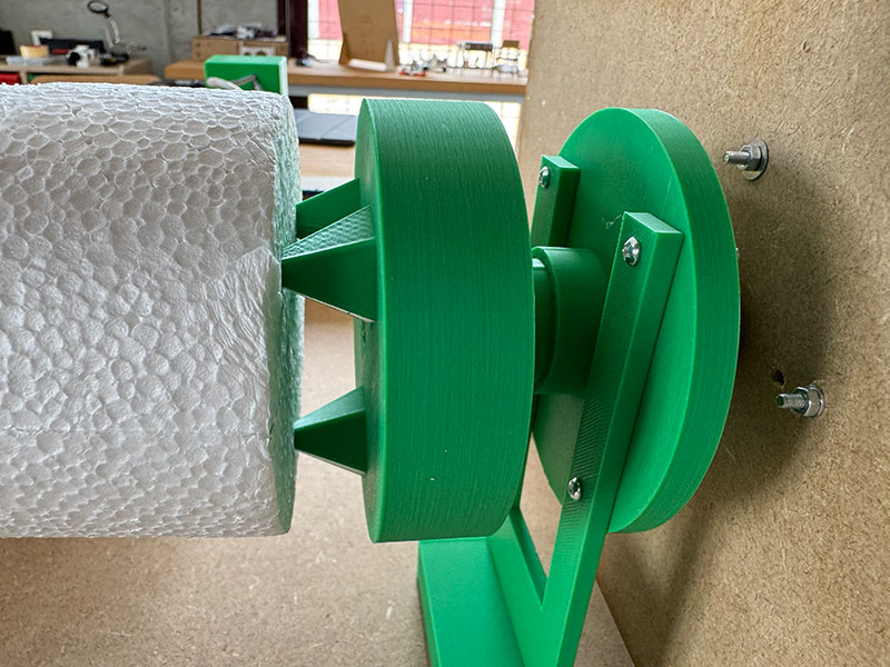 On the opposite side, we used a 3D printed part designed to hold the material by pressure. This piece includes small spikes that slightly penetrate the surface of the material, preventing it from slipping during rotation.