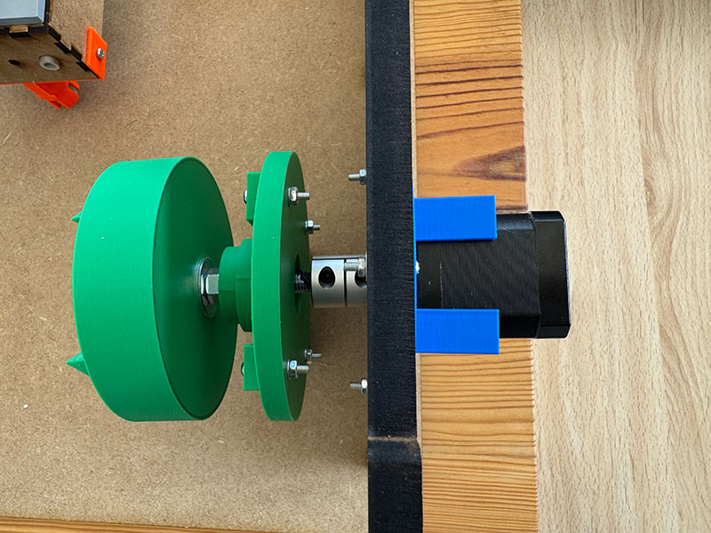 On the motor side, we designed a dedicated support for the Z axis stepper motor. We added a NEMA17 coupling connected to an 8 mm shaft, which links to a threaded rod. This rod is cut to the required length and adjusted using a nut near the material fixation area.