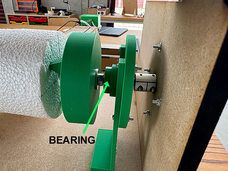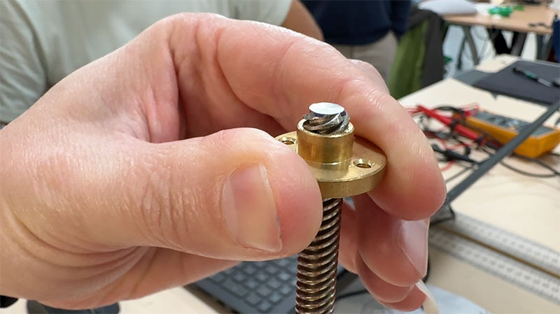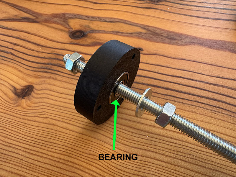 Additionally, we incorporated an extra bearing into the part that holds the material. This element is key, as it prevents the threaded rod from rotating together with the axis.