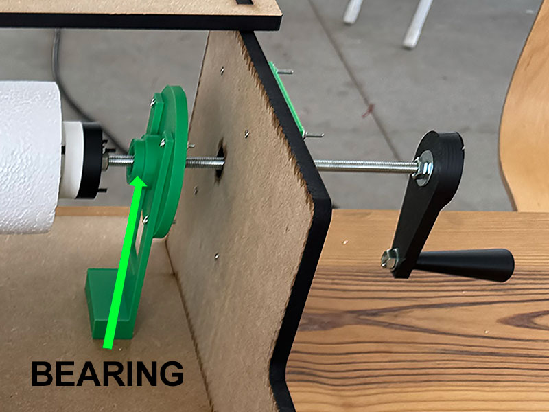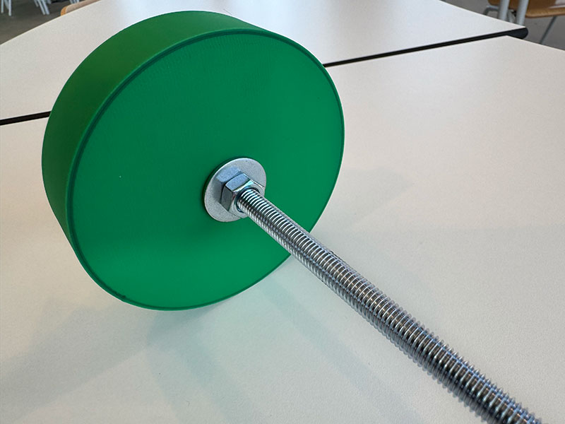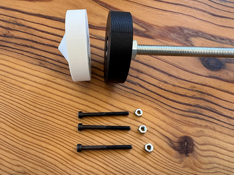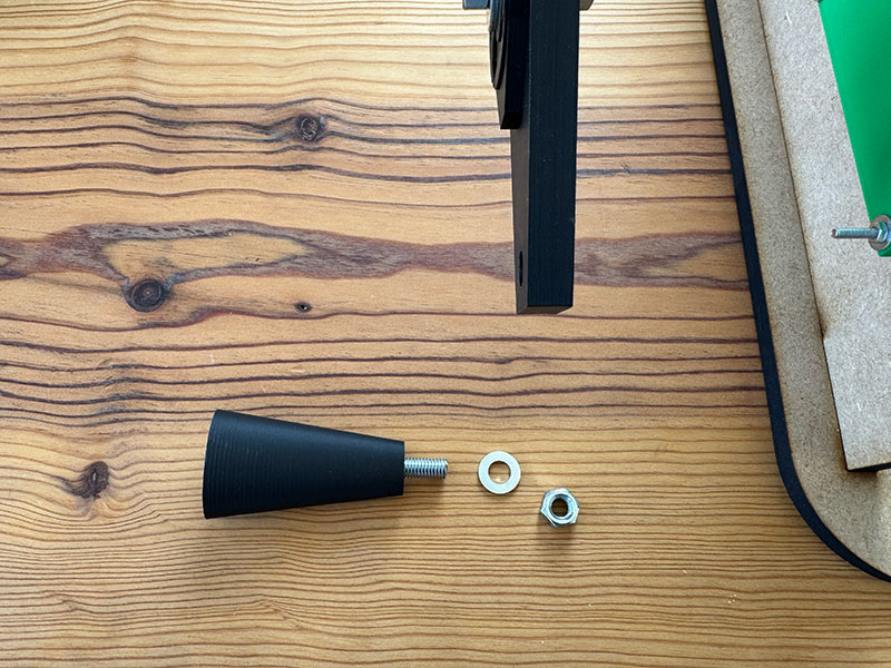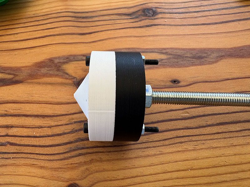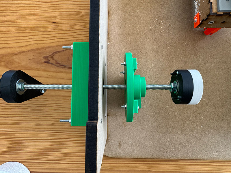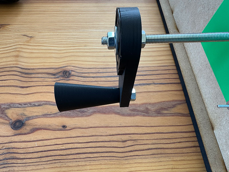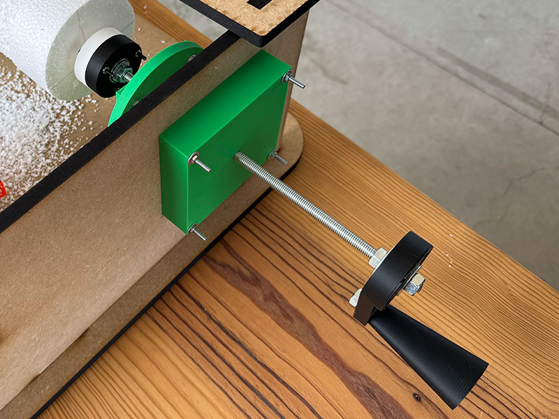 For this end, we used an 8 mm threaded rod with enough length to allow adjustment depending on the size of the material. At the outer end, we added a handle, making it easy to manually adjust and press the material against the rotating support, ensuring a proper fixation.
