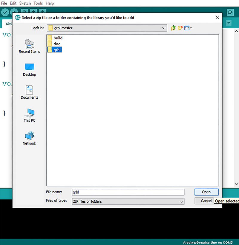 To install GRBL on our board, we followed a tutorial by Dejan (howtomechatronics.com), which explains how to install it as a library and upload the example sketch to the Arduino.