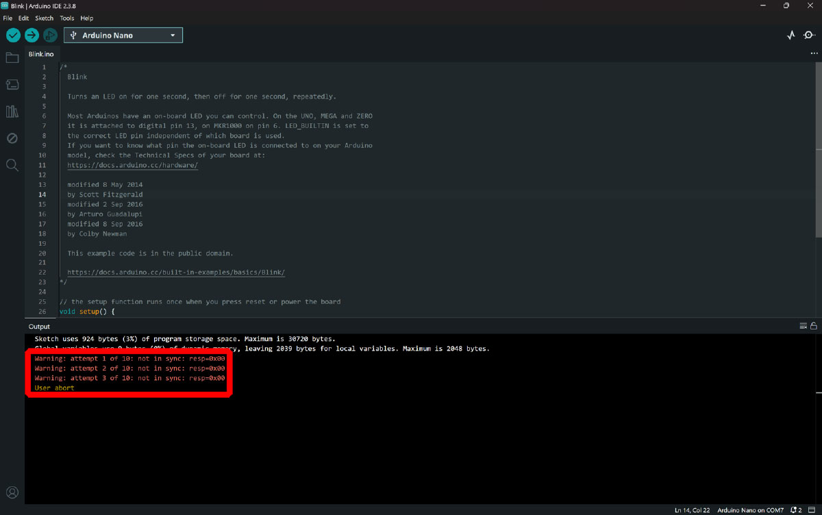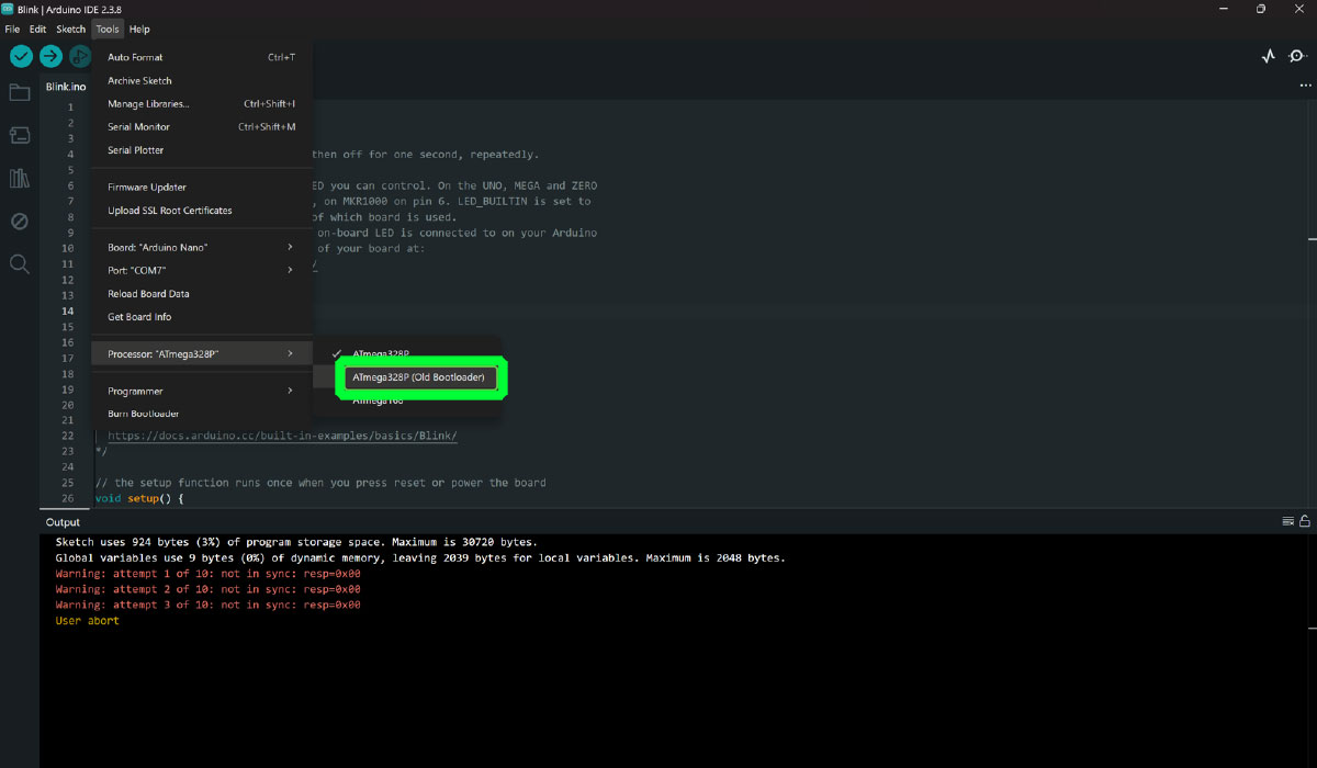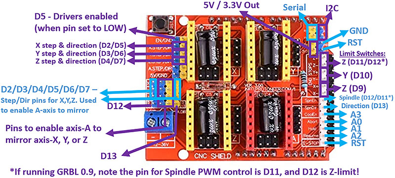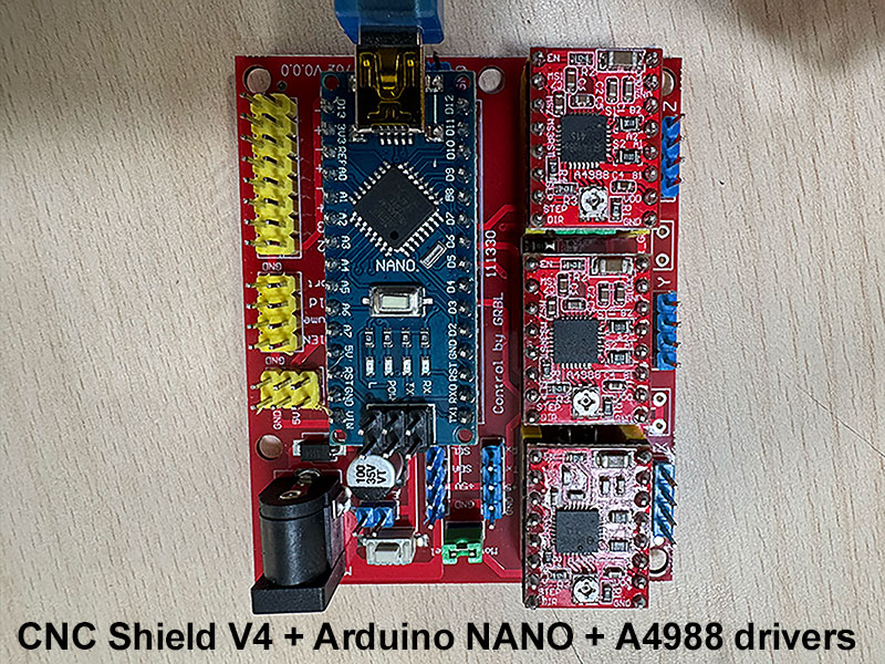In terms of hardware, we initially started using an Arduino Nano, together with a CNC Shield V4 (HW-702_V0.0.0) and A4988 stepper drivers. At first, we even had problems uploading GRBL to the board, which we eventually solved by changing the bootloader to “ATmega328p (Old bootloader)”.
