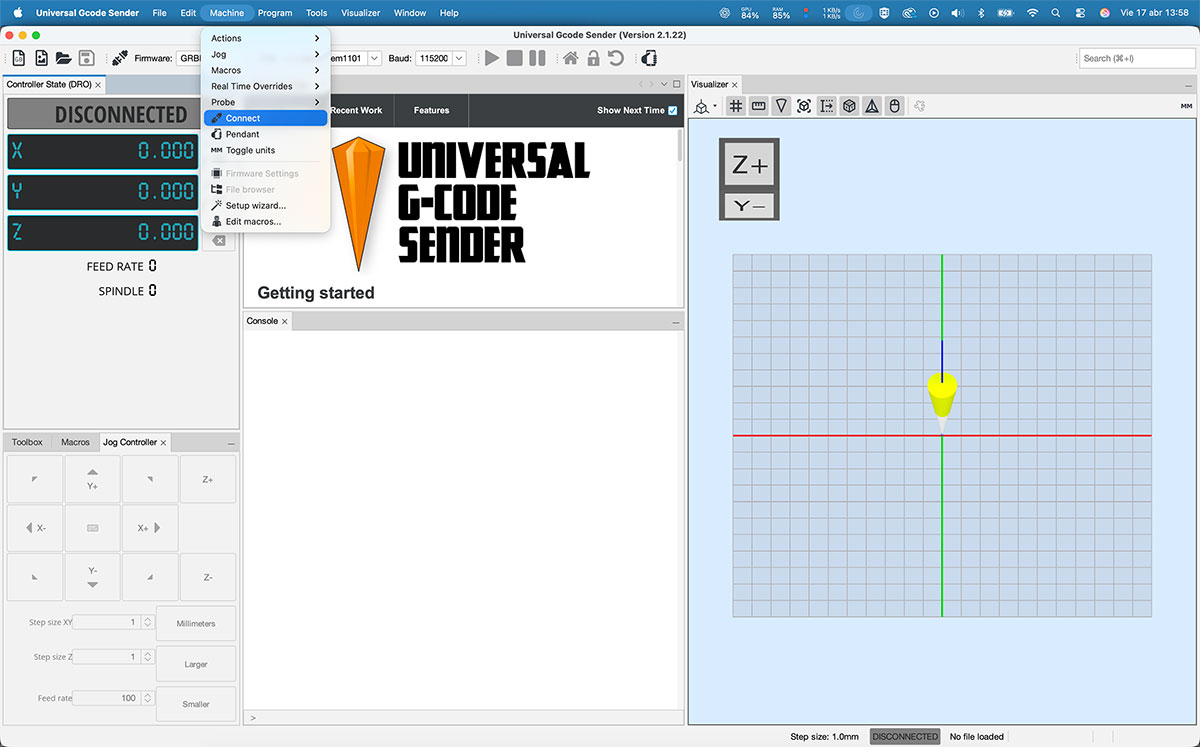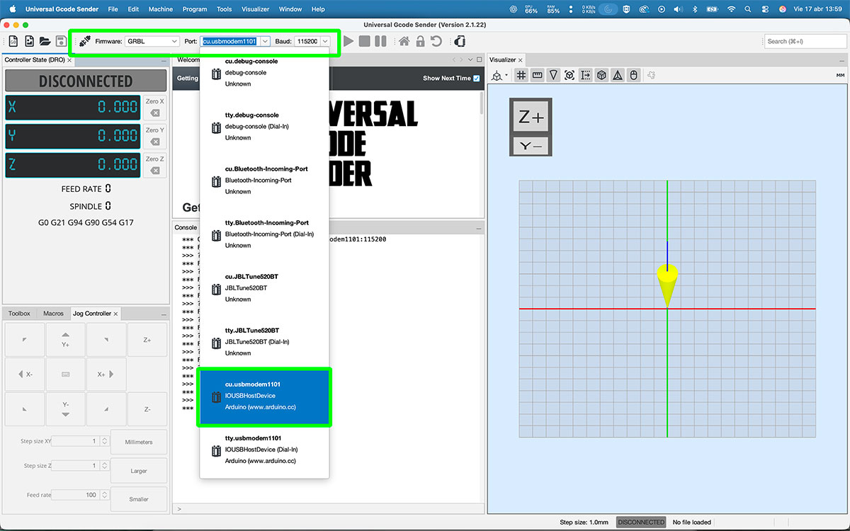 Once the electronics were working properly, the next step was to install and configure the control software. For this, we used UGS (Universal G-code Sender), which can be downloaded from its official website.