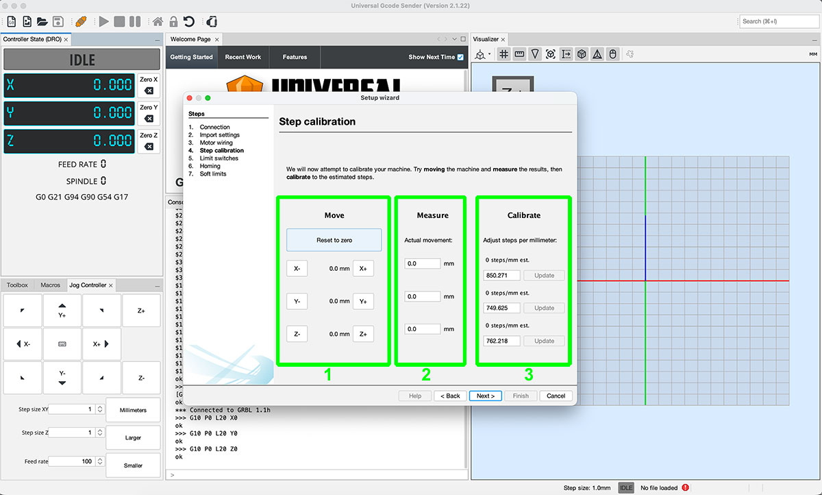 The next step was the machine calibration. For this, we used the calibration tool included in the Setup Wizard.