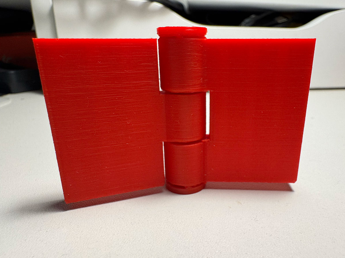 After printing, the hinge works correctly thanks to the tolerances I left between the components. It was particularly interesting to observe how small adjustments in clearance directly affect the final mobility of the mechanism.