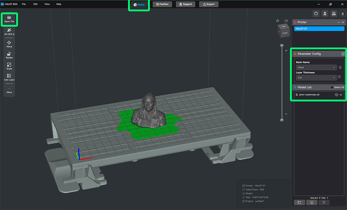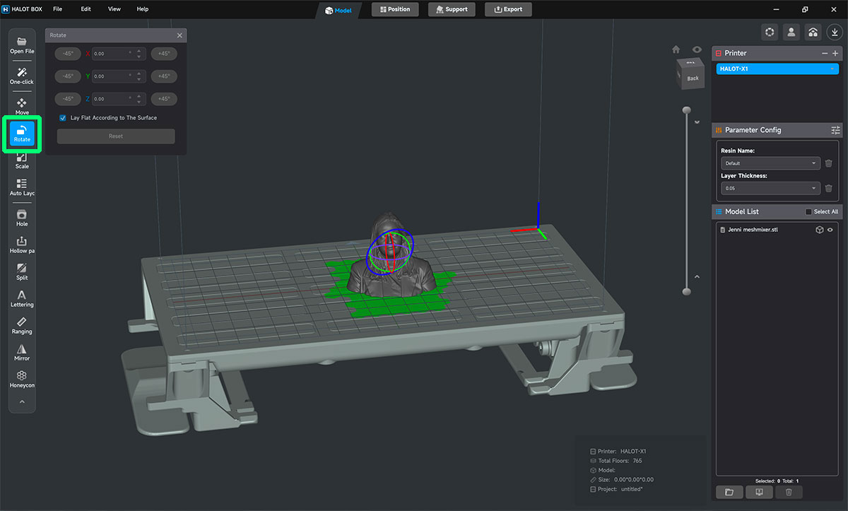 I import the STL file into HalotBox and the first thing I do is review the orientation. In resin printing this is especially important: it is not only about making the part “fit”, but about reducing suction forces between layers and avoiding unnecessary support marks on visible surfaces. In this case, the printing order is reversed compared to what is shown in HalotBox, so supports are not required.