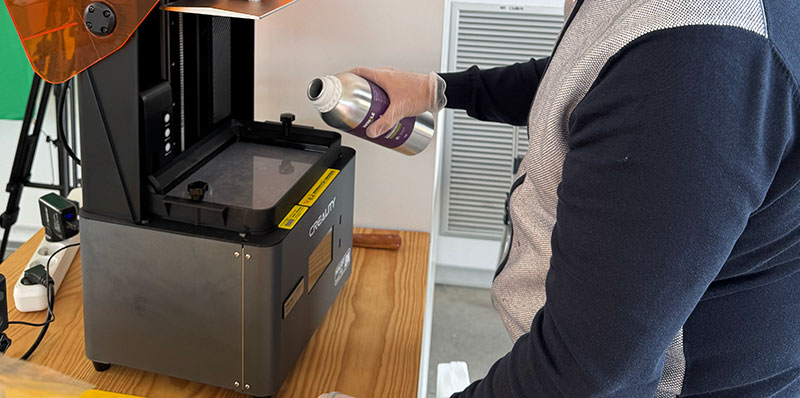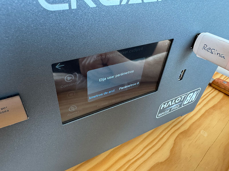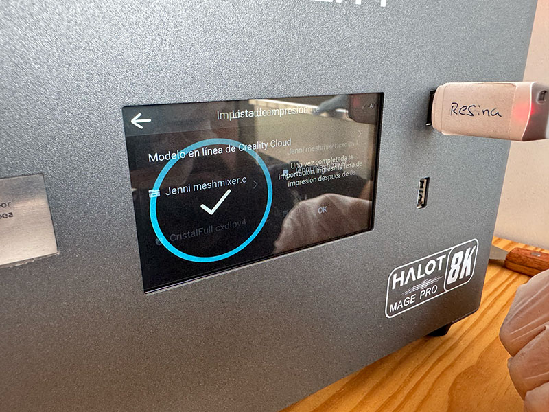 Before starting the print, I shake the resin bottle thoroughly to homogenize the material and pour it into the vat without exceeding the maximum indicated level. I launch the job from the HALOT-MAGE PRO 8K touchscreen and closely monitor the first layers. If the base adheres correctly to the build plate, the rest of the process usually runs smoothly.