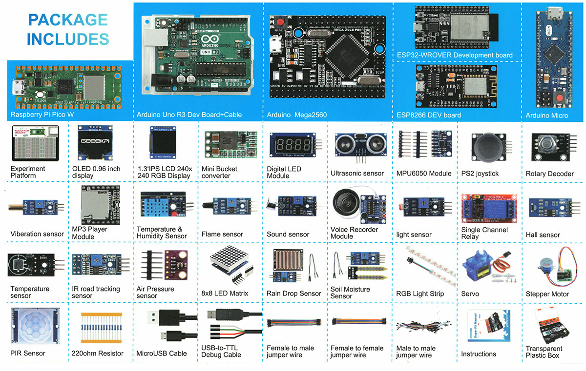 Summary of the sensor modules included in the kit, with their names in English (and Spanish), signal type, and a cropped image taken from the kit photo.