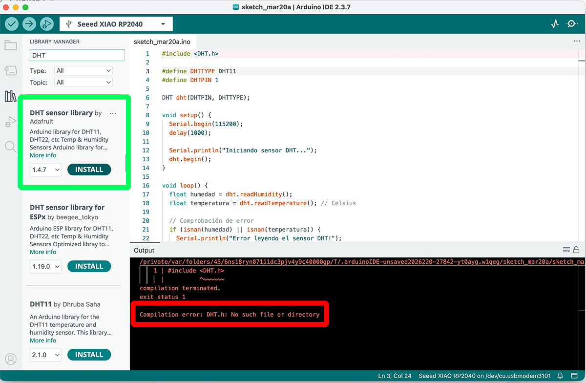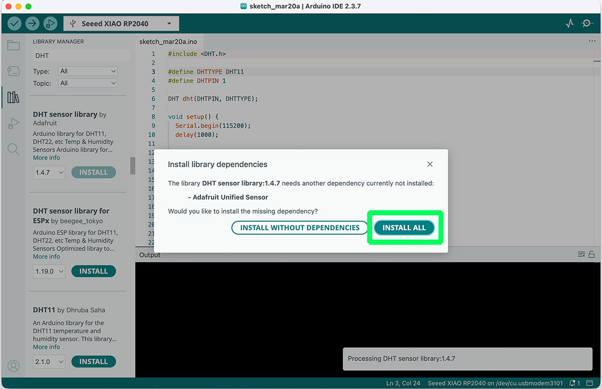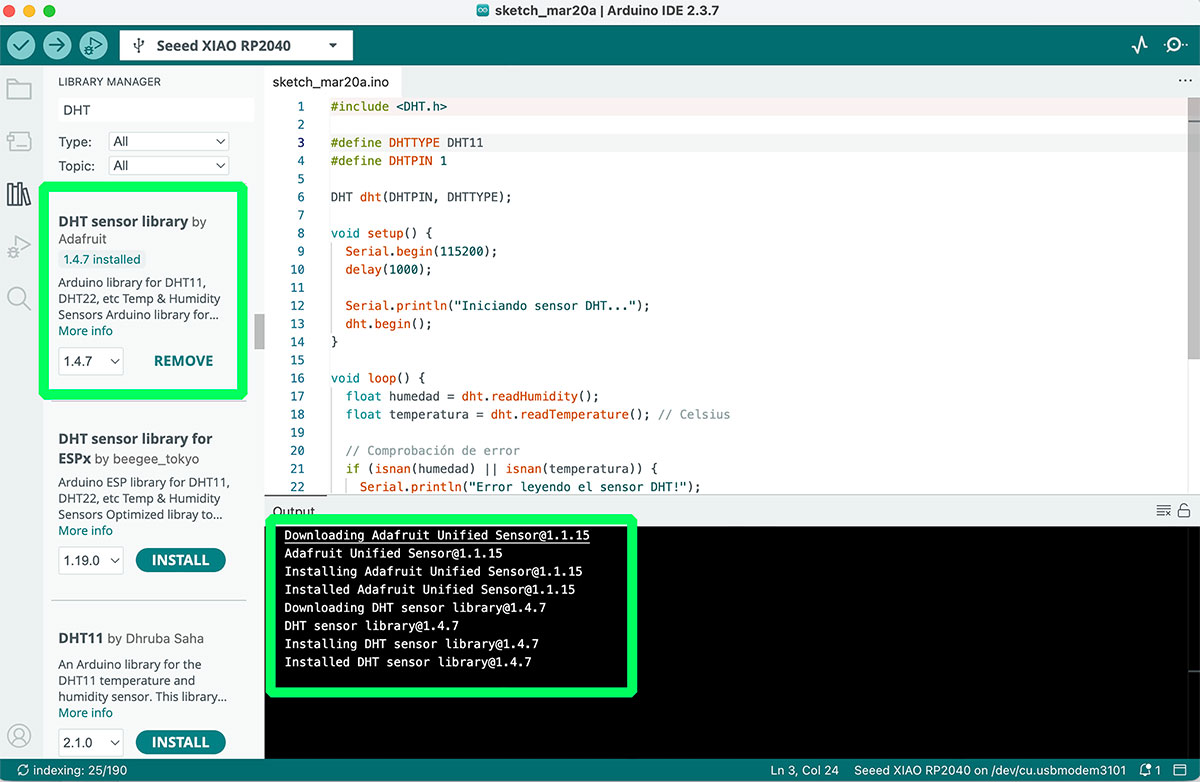 To read the sensor data in Arduino, it is necessary to use the “DHT.h ↗️” library, so I installed it from the Library Manager. During the installation, Arduino indicated that some dependent libraries were also required, such as Adafruit Unified Sensor, which I installed as well.
