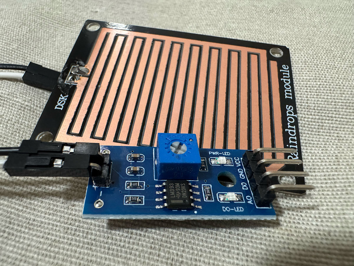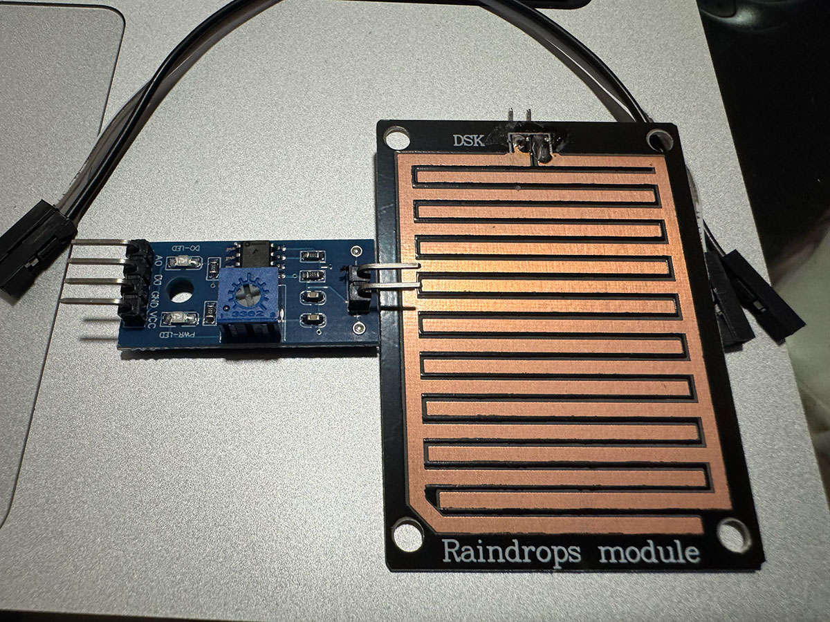The rain sensor used in this project consists of a conductive plate that detects the presence of water through changes in the resistance between its tracks. When water comes into contact with the surface, the conductivity increases, and the electronic module converts this variation into both analog and digital signals. To better understand how the sensor behaves under different conditions, I wrote a simple program that allows me to see in real time what the sensor is “detecting”.