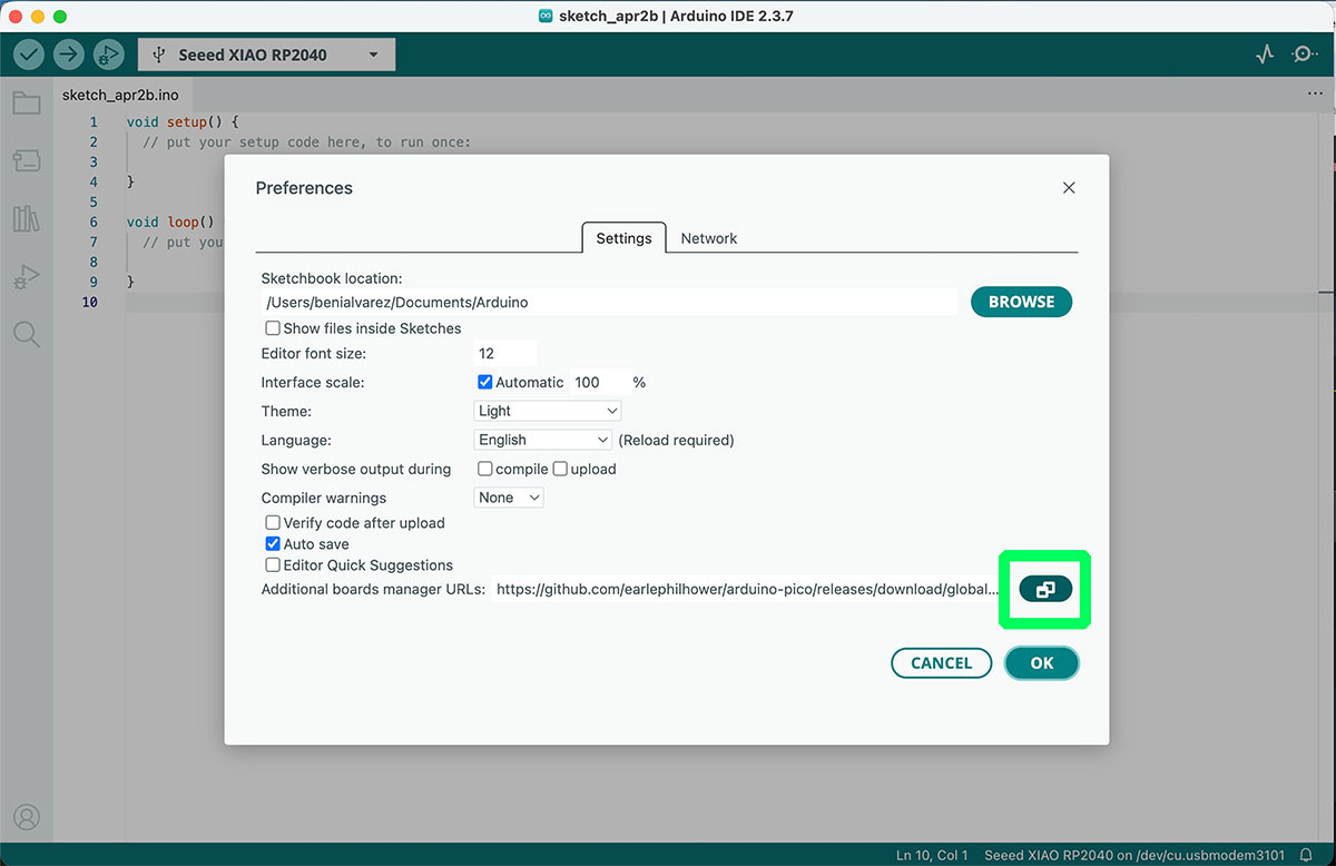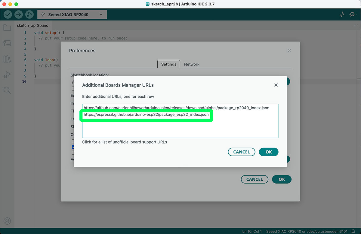 The process starts in the Arduino IDE, by going to Preferences. In the section “Additional Boards Manager URLs”, the following URL must be added: