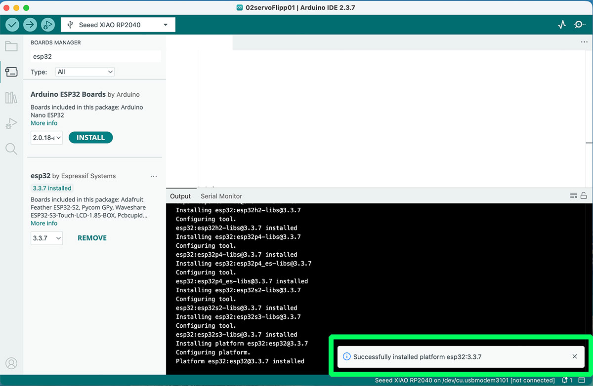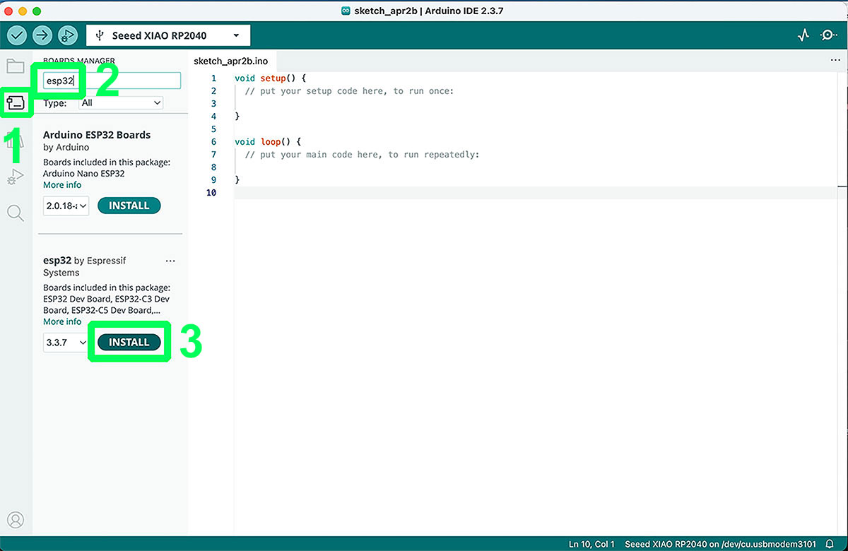 Once the URL is added, the next step is to open the Boards Manager, search for “ESP32”, and install the package “esp32 by Espressif Systems”. After this, the environment is ready to start programming the XIAO ESP32-C6 using Arduino.