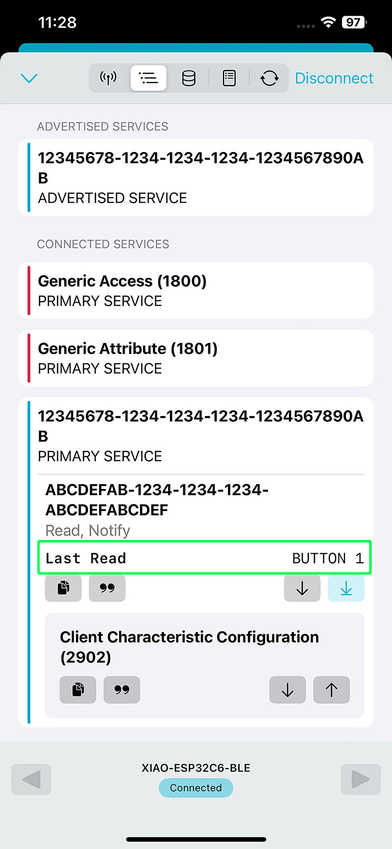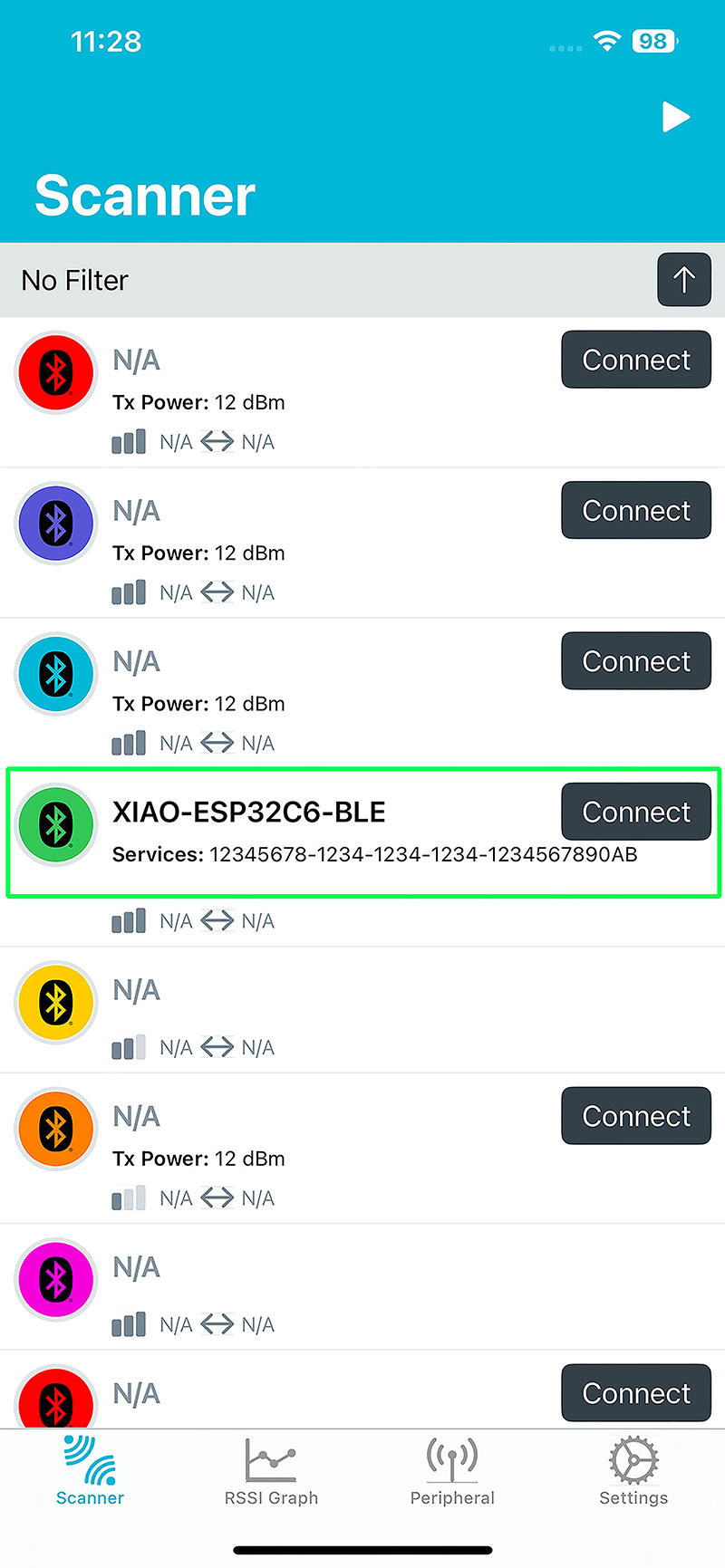 On the client side, I used an iPhone with the application nRF Connect for Mobile, which allows scanning and connecting to nearby BLE devices. Once the app is open, I search for a device named "XIAO-ESP32C6-BLE" and connect to it.