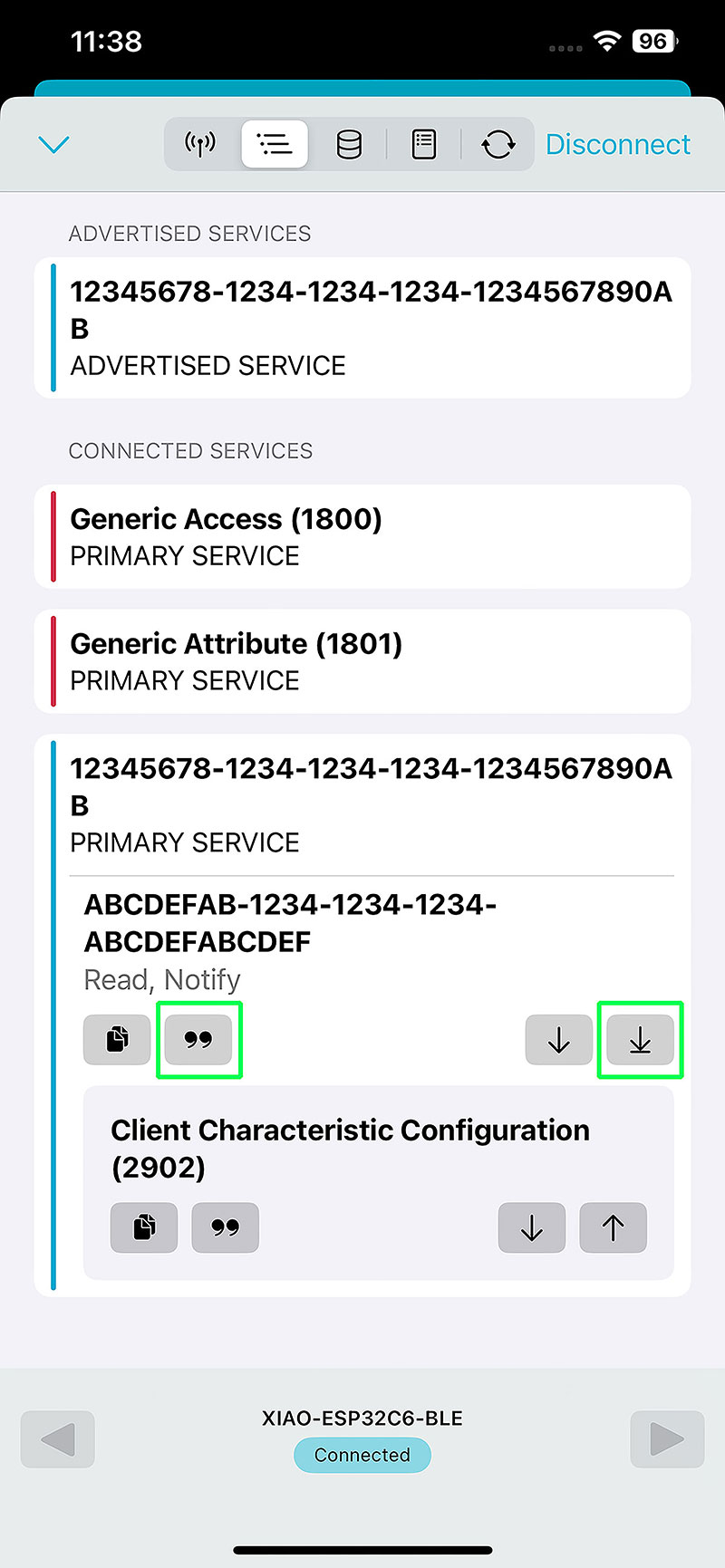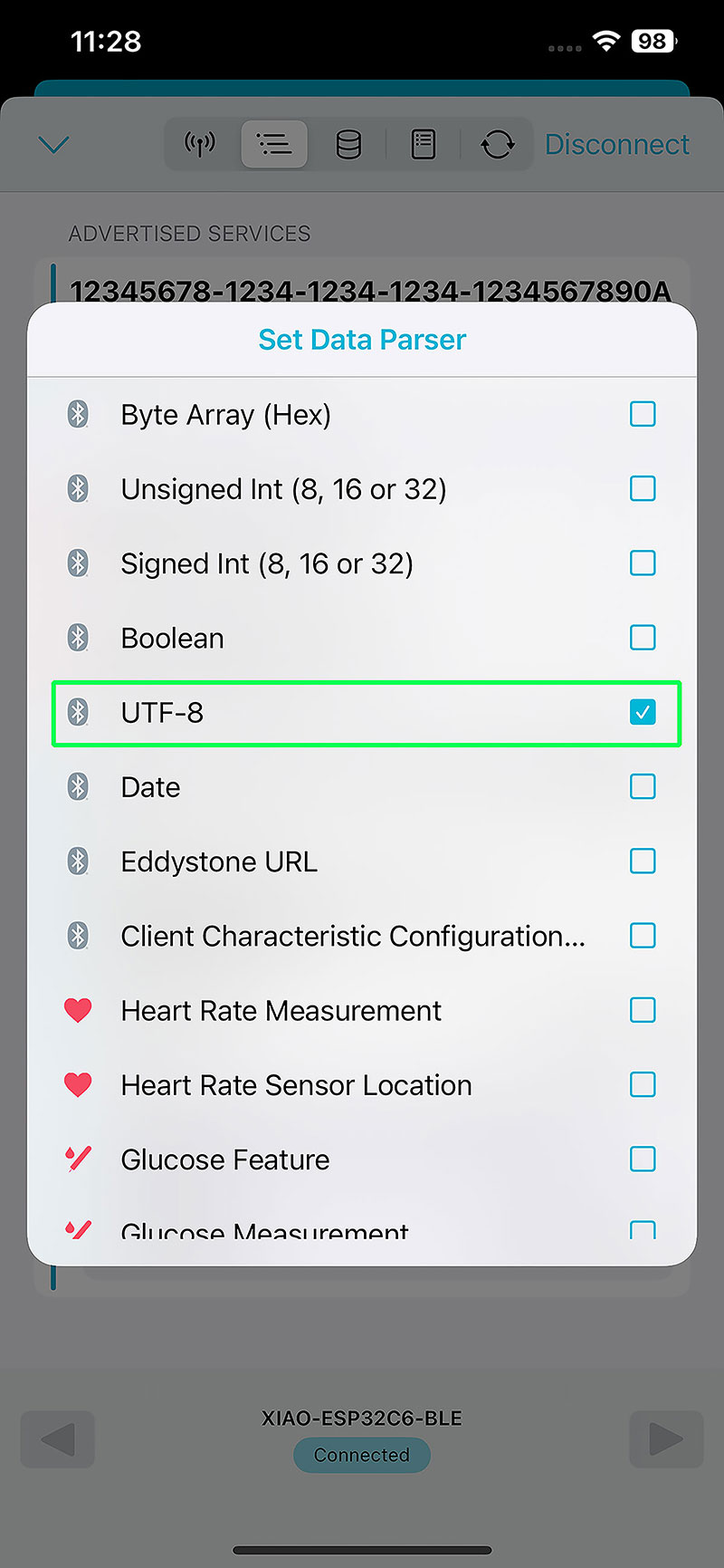After connecting, the available BLE services are displayed. Inside them, I access the characteristic defined in the code using a custom UUID, which in my case is "abcdefab-1234-1234-1234-abcdefabcdef". By enabling data reading and setting the parser to UTF-8, I can visualize the messages sent by the board.