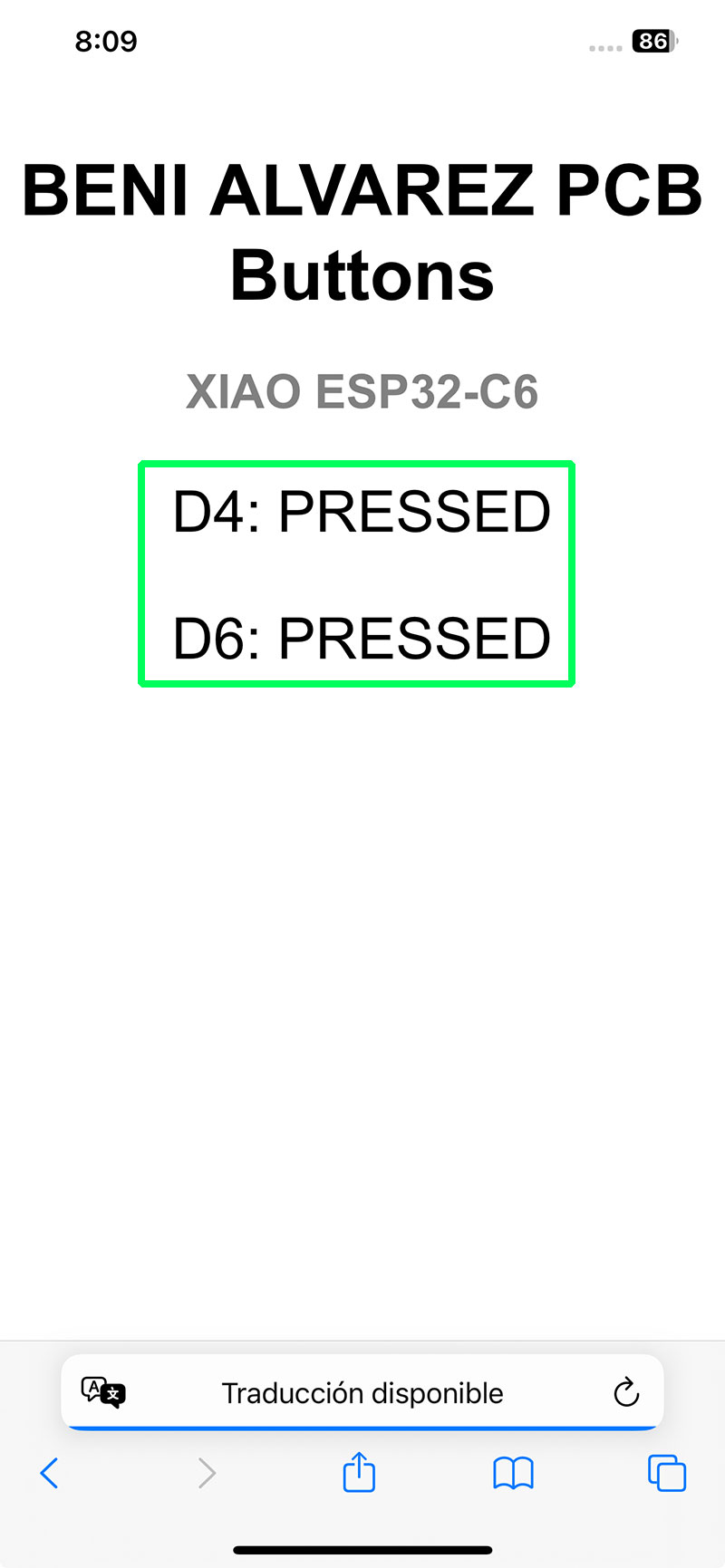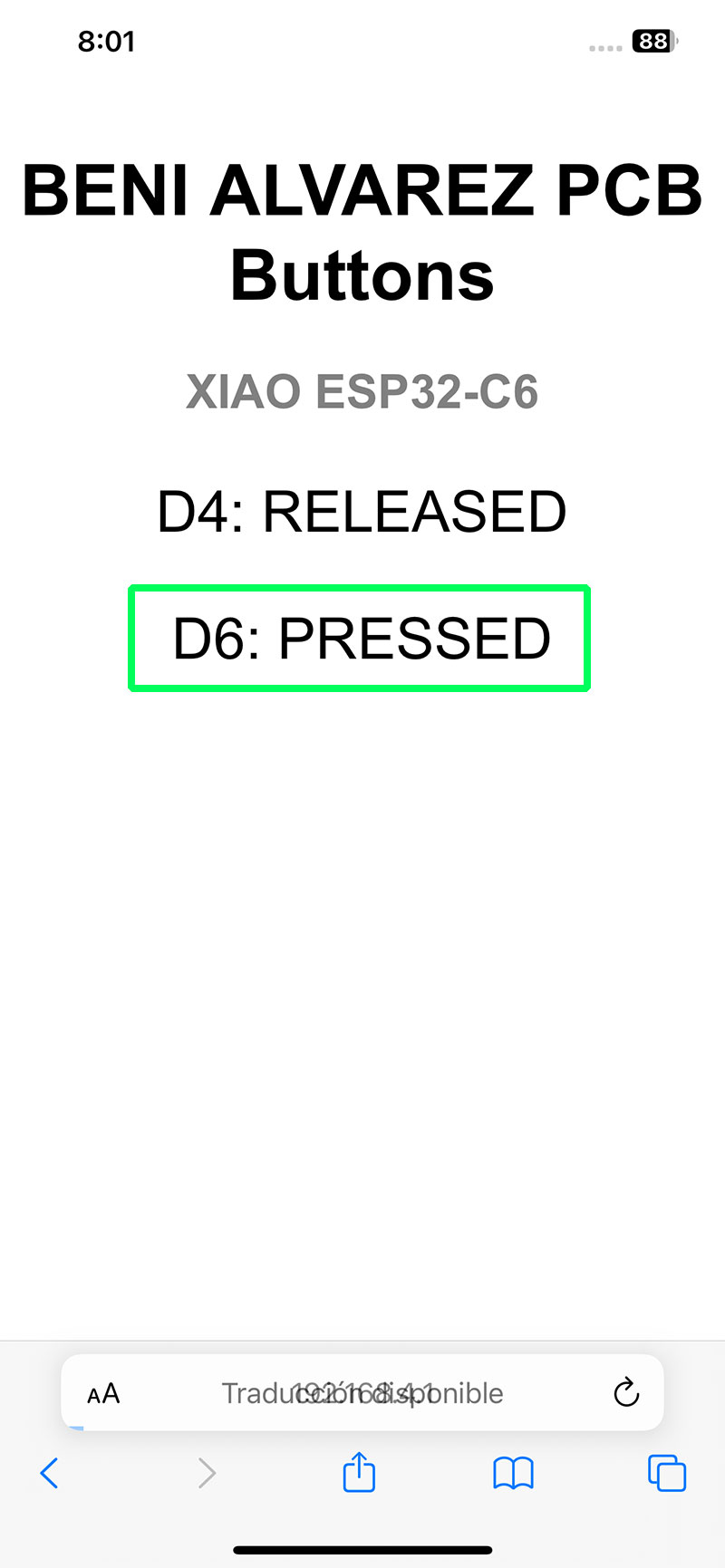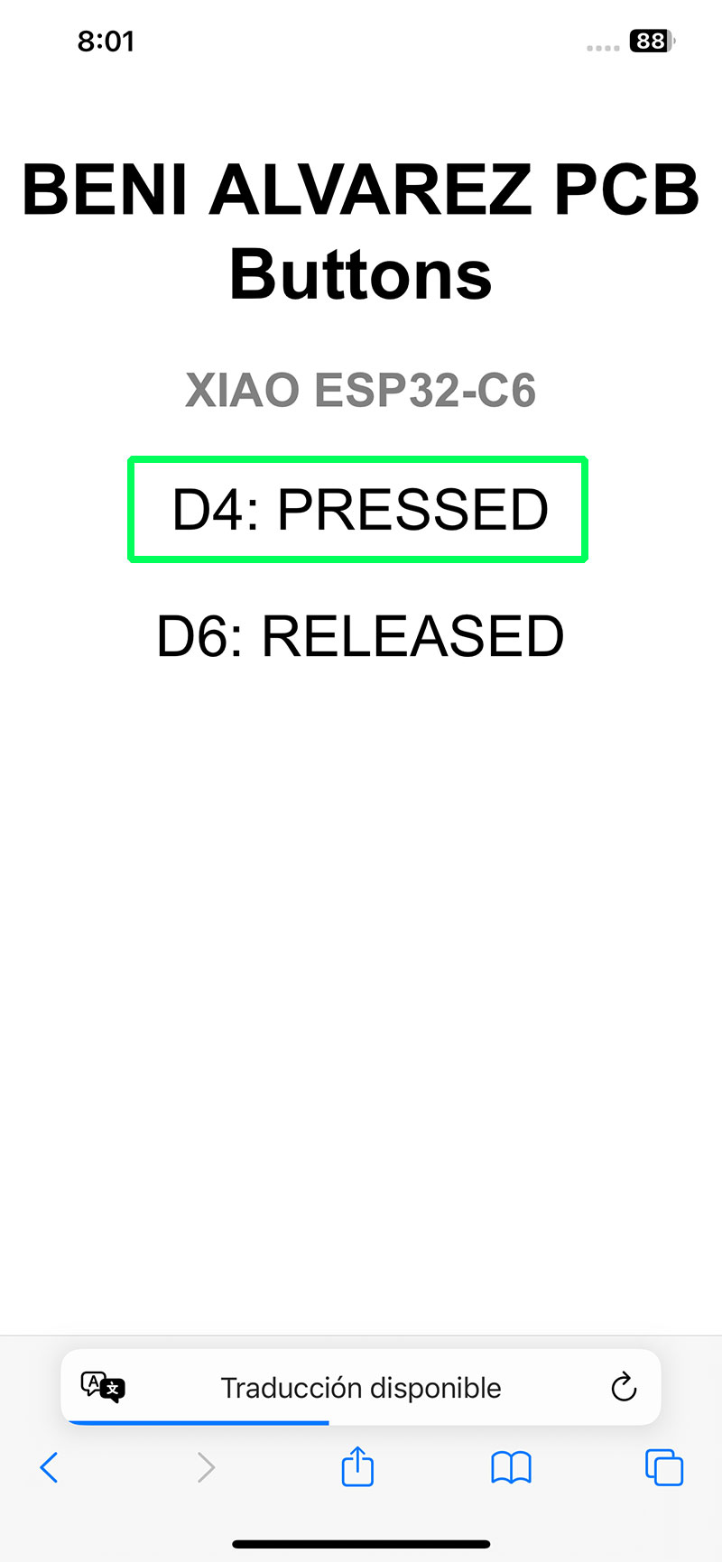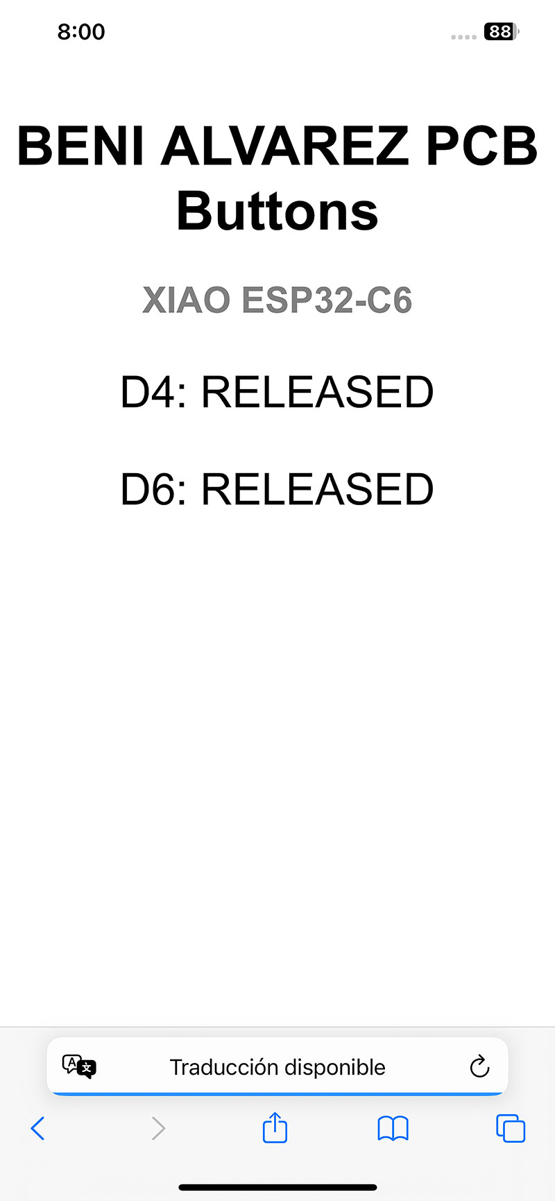 The program reads the state of the two buttons connected to pins D4 and D6 on my PCB. Whenever a button is pressed or released, its state is updated both on a web page and in the serial monitor, giving me two different ways to verify that communication is working correctly.