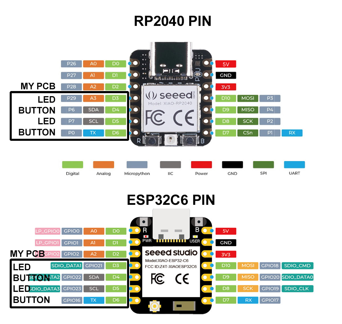 One positive aspect of my design is that the PCB allows me to swap the microcontroller, so I can test different options without changing the whole board. I also have a XIAO ESP32-C6, which adds Wi-Fi and BLE connectivity. However, this does not completely solve the problem, because pins D4, D5, and D6 match the same connections used in the RP2040 version, so they are still occupied by the existing components on the PCB.