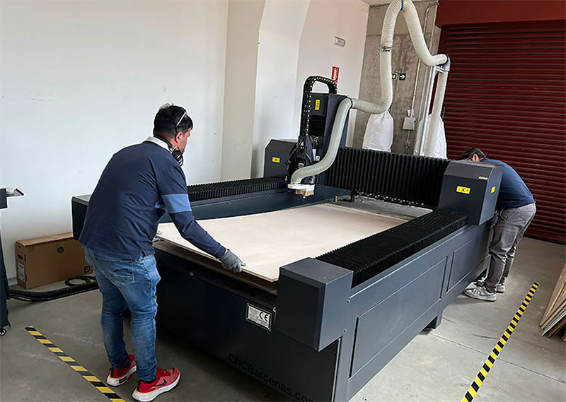 On a large-format CNC like this one, the main fixturing system is the vacuum table, which keeps the material attached to the surface by suction.