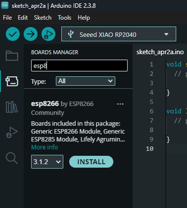 Since I am going to work with new controllers, not only the RP2040 that I have been using so far, the first step is to prepare my Arduino IDE with new tools. To do this, I have to install the board packages for the Wemos ESP12F, the ESP32 Wrover and the Wio Terminal D51R.