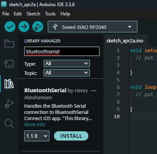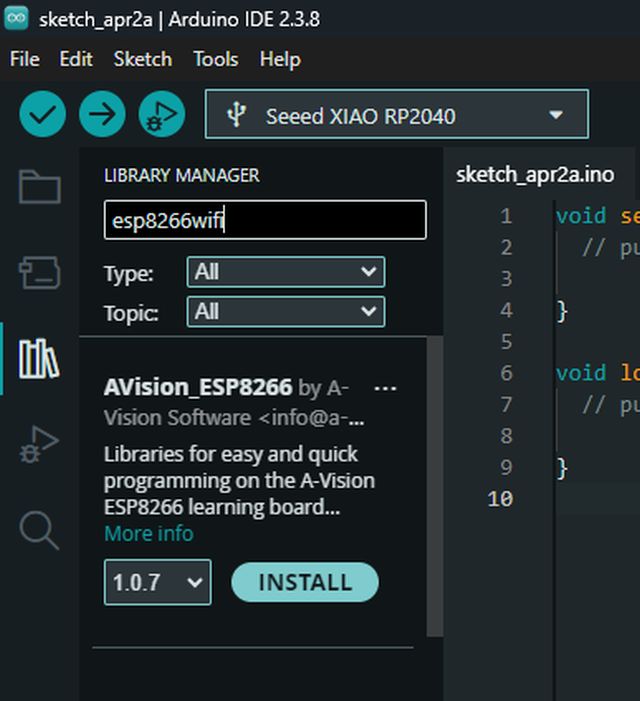 Later, since I am going to work with Bluetooth and WiFi, I also had to install the libraries Avision_esp8266 and Seeed Arduino rpcBLE