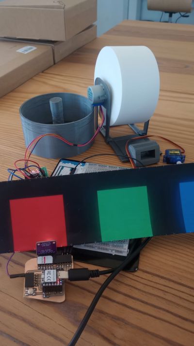 The system consists of a rotating cylinder driven by a stepper motor. On the surface of the cylinder I drew cars in different colors (red and green). A servo motor moves the color sensor, allowing it to scan the surface.