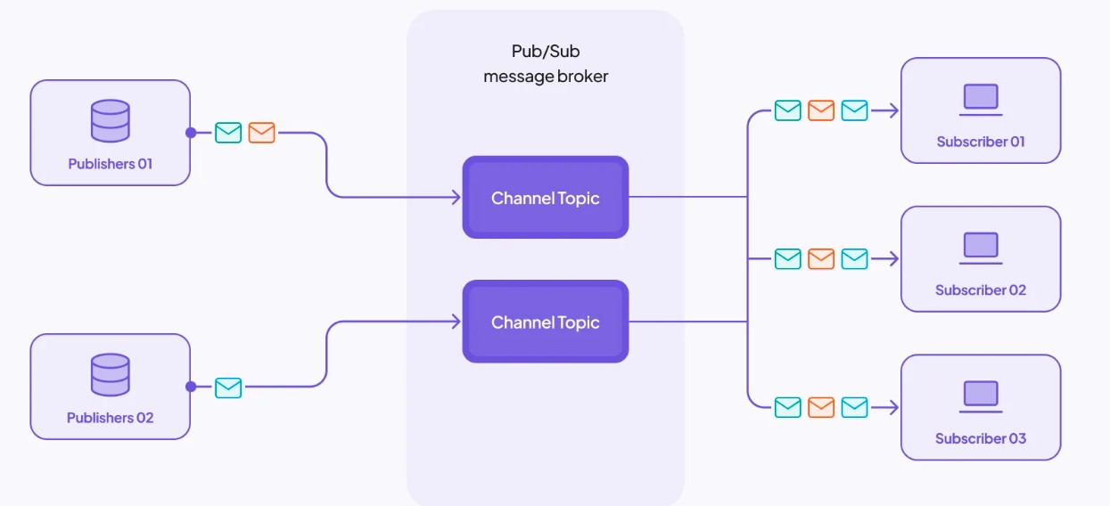 In this system, one node publishes data to a topic, and any subscribed devices receive that data automatically.